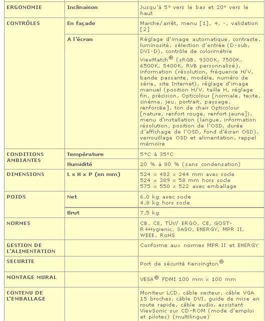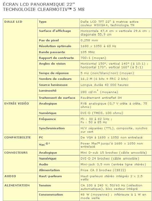 Comme promis un test de mon nouvel écran lcd 22" large.Pour commencer les caractéristiques générales :