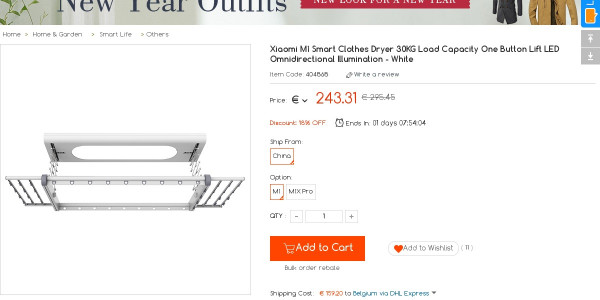 Recevez une réduction sur le Xiaomi M1 Smart Clothes Dryer (-10$) ou en utilisant le code XFDKVHUE. Ce bon plan est valable jusqu'au 19/01.