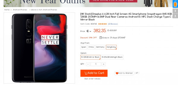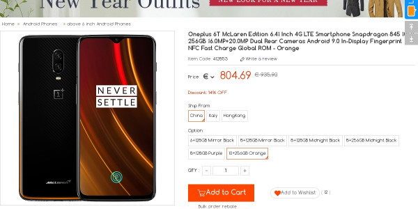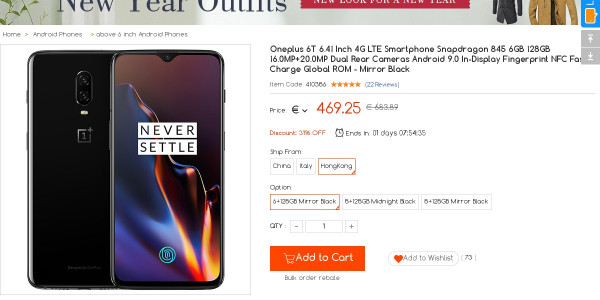 Recevez une réduction sur le OnePlus 6T 10GB+256G orange (-76$) ou en utilisant le code HRVLQXGU. Ce bon plan est valable jusqu'au 11/02.