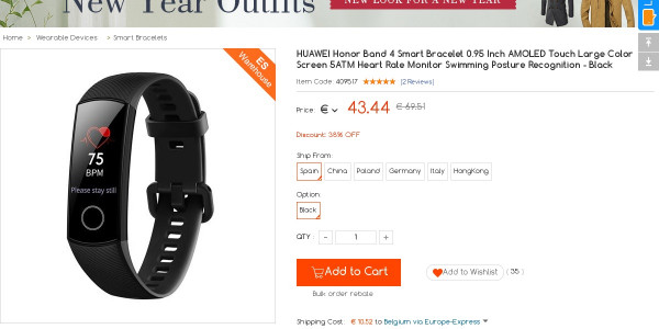 Recevez une réduction sur le [ES STOCK] HUAWEI Honor Band 4 Smart Bracelet (-5$) ou en utilisant le code GLQORRBX. Ce bon plan est valable jusqu'au 07/02.