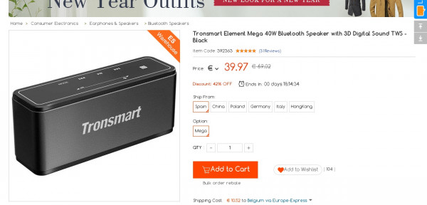Recevez une réduction sur le [ES STOCK]Tronsmart Element Mega 40W Bluetooth Speaker (-6$) ou en utilisant le code ABVTMPTX. Ce bon plan est valable jusqu'au 07/02.