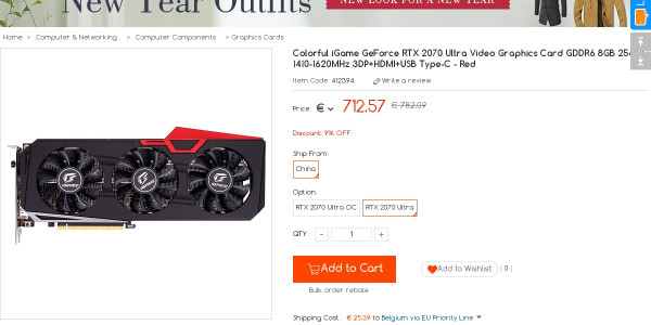 Recevez une réduction sur le Colorful iGame GeForce RTX 2070 Ultra Video Graphics Card GDDR6 8GB 256Bit (-120$) ou en utilisant le code WFXZCAQU. Ce bon plan est valable jusqu'au 25/01.