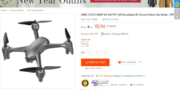 Recevez une réduction sur le SMRC ICAT2 1080P 5G Wifi FPV GPS Brushless RC Drone (-4$) ou en utilisant le code BYXEBFGY. Ce bon plan est valable jusqu'au 25/01.