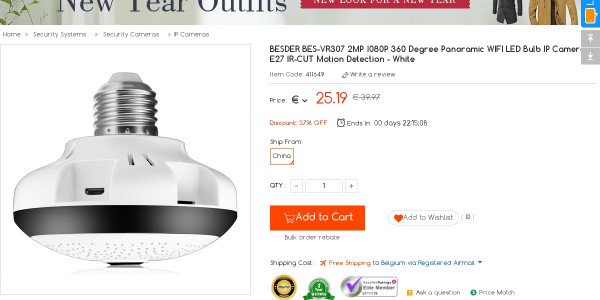 Recevez une réduction sur le BESDER BES-VR307 2MP 1080P 360 Degree Panoramic WIFI LED Bulb IP Camera (-2$) ou en utilisant le code ENNPLISL. Ce bon plan est valable jusqu'au 25/01.