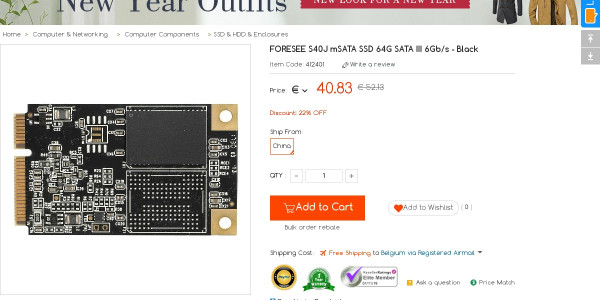Recevez une réduction sur le FORESEE S40J mSATA SSD 64G SATA III 6Gb/s - Black (-7$) ou en utilisant le code VJBCEXAD. Ce bon plan est valable jusqu'au 26/01.