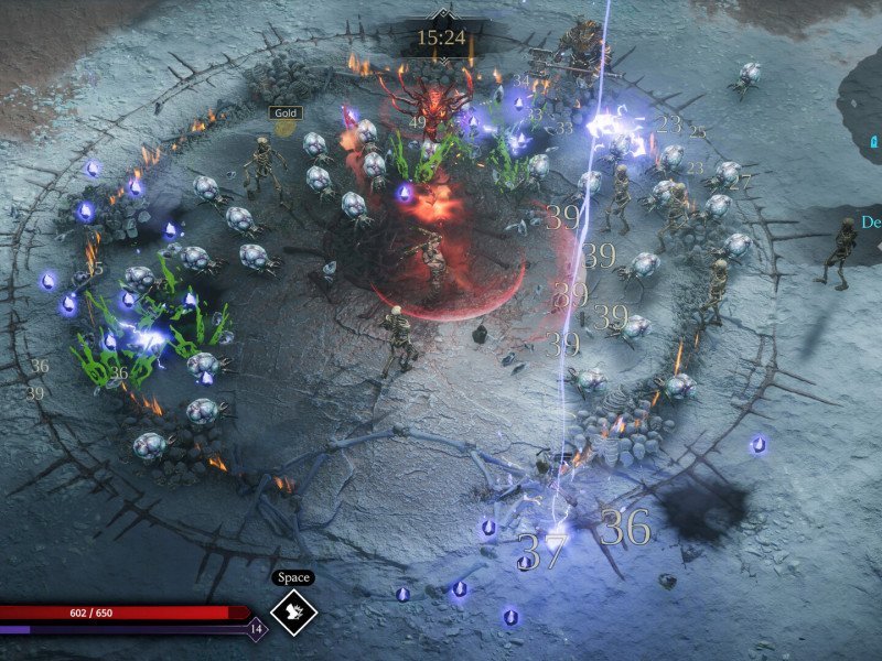 Le gameplay de Jotunnslayer: Hordes of Hel est axé sur l'action rapide, où les joueurs peuvent utiliser une variété de compétences et d'armes. Au départ, les joueurs peuvent choisir entre plusieurs classes, comme le Berserker, chacune dotée de capacités spécifiques qui définissent leur façon d'affronter les ennemis. Les mécanismes sont intuitifs : le jeu permet des attaques automatiques, permettant aux joueurs de se concentrer sur l'utilisation de capacités spéciales, comme la foudre qui détruit les ennemis proches. L'une des mécaniques les plus intéressantes est la possibilité d'obtenir des améliorations et des compétences au combat, rendant chaque partie unique. De plus, il faut une dimension stratégique pour choisir les compétences à améliorer et quand utiliser les plus puissantes, comme « Frappe Tonnerre », essentielle pour affronter les boss et les vagues d'ennemis. L'équilibre entre attaque, défense et récupération de santé rend le jeu à la fois stimulant et gratifiant. Bien que ce soit le cœur du jeu, il y a bien plus à débloquer, comme des armes, des skins, des modificateurs ou même des niveaux de difficulté et des trophées à gagner en remplissant certains prérequis. Certains s'obtiennent grâce aux pièces récoltées à chaque partie, d'autres en terminant les niveaux de difficulté supérieure. En fin de compte, cette quête constitue la rejouabilité du jeu. Ça n'en a peut-être pas l'air, mais il y a beaucoup à faire. De plus, un événement temporaire permet désormais de débloquer des skins d'armes supplémentaires.