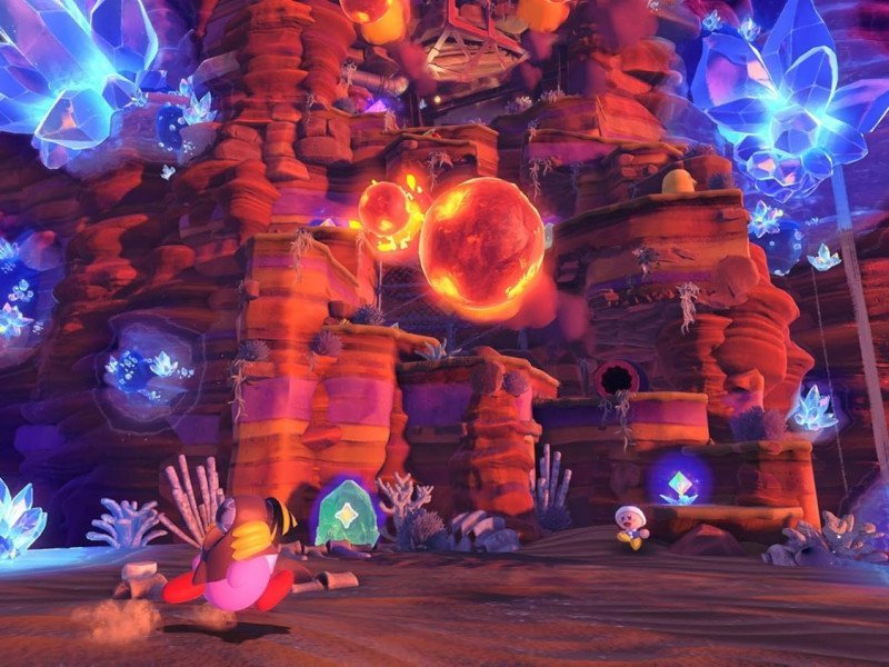 Comme nous l'avons vu avec la version de Super Mario 3D World, sortie sur Switch avec le nouveau chapitre « Fureur de Bowser » , Kirby et le monde oublié propose un nouveau chapitre. Une mystérieuse météorite s'est écrasée, prête à libérer ses sombres pouvoirs. La solution consiste à rassembler suffisamment d'Étoiles (les Waddle Dees de la météorite) pour restaurer l'étoile et sauver le monde d'une destruction certaine. Les joueurs qui commencent une nouvelle partie pourront accéder aux niveaux du nouveau chapitre après avoir terminé le premier monde, tandis que ceux qui tentent de s'en sortir en poursuivant leur sauvegarde initiale auront accès à tous les niveaux d'un coup, sans aucune autre action requise. À première vue, les choses ne semblent pas très différentes du jeu principal. La logique de réussite des niveaux dans "Le pays des étoiles filantes" est identique à celle du jeu original. En effet, les joueurs doivent à nouveau atteindre la ligne d'arrivée et débloquer les Starries qui les attendent, tandis que l'accomplissement de missions spécifiques leur permettra d'en gagner davantage. Certains joueurs, même les plus exigeants, pourraient dire qu'il est inutile de s'attarder sur ce chapitre, car l'action semble se dérouler dans les niveaux existants. Et c'est vrai. Cette extension ne se déroule nulle part ailleurs. Ses douze niveaux sont répartis sur les six mondes du titre, ce qui rend la progression du chapitre encore plus rapide pour les joueurs existants. Et c'est vrai. Cependant, la qualité de chaque niveau change considérablement. À l'exception des stages du premier monde, où l'on ressentait un sentiment de déjà-vu des originaux, les levels restants offrent une expérience de jeu plus chaleureuse et plus agréable. Le design déjà astucieux, avec ses éléments cachés et ses nombreux objets à collectionner qui attendent d'être révélés, est encore amélioré par l'ajout des cristaux. Les cristaux, dispersés dans l'espace, peuvent révéler de nouveaux chemins et de nouveaux éléments à explorer, tout en transformant l'environnement et en donnant l'impression que quelque chose de nouveau est réellement là. Des ponts surgissent de nulle part, les obstacles disparaissent… et, en résumé, un nouveau monde s'ouvre aux joueurs, avec de nouveaux adversaires et de nouvelles transformations spatiales pour Kirby, offrant un véritable renouveau à la formule existante.