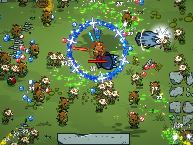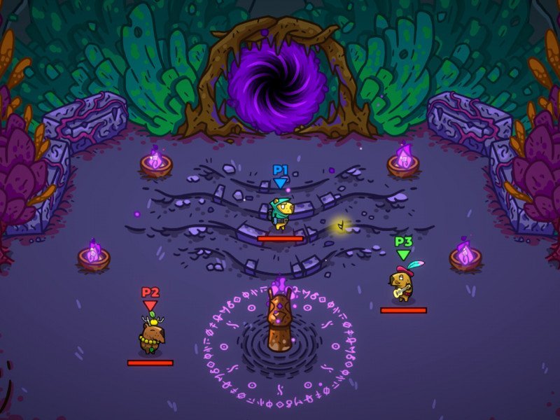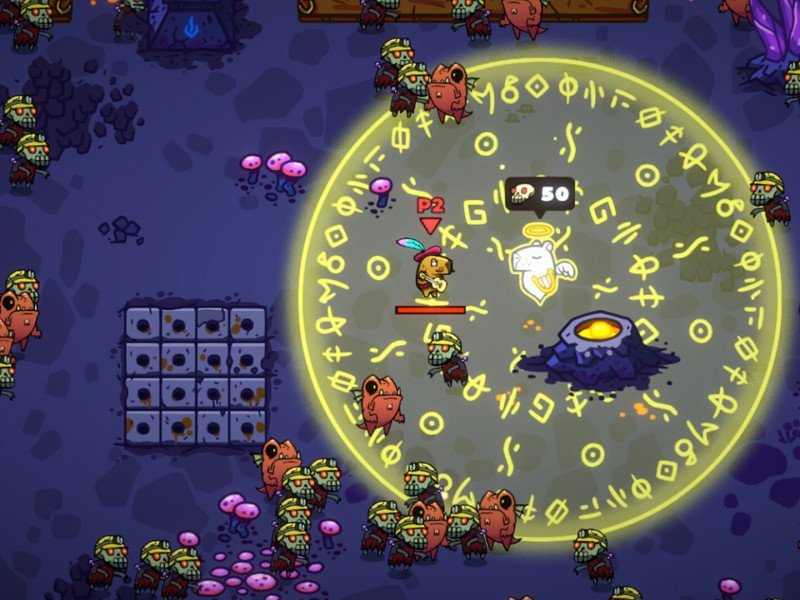 Bien que vous puissiez jouer à Extremely Powerful Capybaras seul, le jeu est conçu pour le jeu coopératif, et c'est là qu'il excelle. Les mécaniques de jeu restent les mêmes, que vous jouiez seul ou avec un ami (en ligne ou hors ligne), et l'objectif est le même : éliminer des hordes d'ennemis niveau après niveau, gagner de l'expérience et améliorer votre capybara, que vous choisirez parmi les classes disponibles. Vous vous déplacerez dans le jeu à l'aide d'un twin-stick shooter, et apprendre à utiliser votre classe (et, surtout, le build que vous assemblerez progressivement) est la clé pour maximiser votre plaisir. Le Barde est un capybara musical qui utilise la musique pour attaquer ; le Druide tire des projectiles floraux dans quatre directions diagonales ; l'Assassin possède des étoiles ninja appelées « tourne-vitesse » qui entourent son utilisateur et rayonnent vers lui ; et le Guerrier est équipé d'une lance. Chaque classe a des statistiques différentes, mais pour les consulter, vous devrez vous placer sur le piédestal de la classe souhaitée, puis mettre en pause et sélectionner les statistiques. À la manette, Extremely Powerful Capybaras est très facile à prendre en main, mais peut vite devenir lassant en raison de l'absence de narration pour motiver le joueur. Ce problème est atténué en coop, car l'objectif devient alors de semer le chaos, et à ce stade, tout est permis. La variété des classes et des améliorations est intéressante, même si elles ne suffisent pas à elles seules à soutenir l'ensemble du jeu.