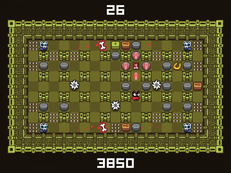 La difficulté du jeu augmente évidemment avec le nombre d'ennemis à l'écran et la réduction de notre marge de manœuvre, mais nous avouons avoir rarement rencontré de difficultés. Oui, si vous mourez, vous recommencez, mais l'ennui est davantage dû aux mécaniques de jeu qu'à la difficulté. On y contrôle un petit chaton noir qui évolue dans des environnements composés de grilles remplies de murs indestructibles et d'autres obstacles facilement identifiables, destructibles à la bombe. Le placement des bombes est identique à celui de Bomberman : on pose la dynamite avec un bouton et on s'enfuit en essayant d'éviter l'autodéflagration . Quelques secondes plus tard, la bombe explose, détruisant murs et ennemis. Le jeu propose une bombe relativement facile à manier et infligeant des dégâts en un point précis à courte portée, ce qui permet d'éviter assez facilement de se faire exploser. Cependant, il est important de noter que les ennemis peuvent marcher sur les bombes ; contrairement à la licence Konami, il est donc impossible de les coincer contre un mur ou autre. En résumé, le jeu se résume à cela : il a perdu l'originalité de Bomberman et a été dépouillé de tout artifice pour devenir un jeu de réflexion où il faut choisir les chemins à emprunter afin d'éviter un maximum d'obstacles. Pour pimenter un peu les choses, on peut récupérer quelques objets optionnels , mais ceux-ci n'apportent rien au jeu, se limitant à un petit bonus destiné aux joueurs les plus assidus . Malheureusement, comme mentionné précédemment, Bomb Kitten manque de mordant et d'originalité, et le recyclage excessif du gameplay et des éléments esthétiques, combiné à un gameplay principal assez lent et répétitif, ne donne pas envie de s'y accrocher. Par ailleurs, Bomb Kitten peine à se démarquer graphiquement , se contentant du strict minimum avec des animations médiocres et une esthétique fade et sans identité. Son design épuré évoque immédiatement « Bomberman », mais manque cruellement de créativité, et même l'effet nostalgique initial s'estompe rapidement face à un gameplay trop simplifié et peu vivant. La différence de couleur entre les biomes est appréciable, mais insuffisante pour un titre qui a du mal à trouver sa place. Il en va de même pour la bande-son , assez répétitive et sans inspiration. Enfin, le jeu est dépourvu de langue française, mais il n'y a pratiquement rien à lire.