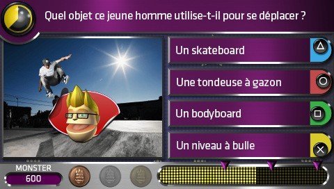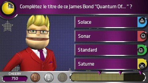 Pour l'occasion, les développeurs ont étendu le mode solo, afin de coller le joueur à sa partie, ce qui permettra de débloquer rapidement des récompenses et trophées en tout genre. Côté technique, c'est assez basique graphiquement et le studio TV a été considérablement réduit pour s'adapter à l'écran de la PSP. Rose (l'assistante) n'est pas présente non plus. La jouabilité est excellente (un bouton par réponse), de quoi retrouver rapidement ses marques. La durée de vie est à la hauteur avec pléthore de questions, et le multi-joueur permet de passer la PSP de mains en mains, afin que six participants puissent s'affronter sur la même console. Naturellement, plus la question est difficile, plus elle rapportera de points. Sinon il est toujours possible de jouer en réseau sans fil jusqu'à quatre joueurs.
