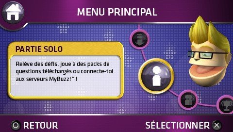 Un jeu façon show télévisé ? Oui on pourrait présenter Buzz comme cela, surtout que l'ambiance est électrique dès le début et que le présentateur a un humour parfois douteux. Ce nouveau volet propose cette fois divers questionnaires de culture générale, consacrés à la musique, au sport, aux célébrités, aux sciences, à la nature, au cinéma, à la télévision et à la culture avec un grand C. On dénombre pas mal de questions relatives à la France d'ailleurs, logique vu la thématique du jeu. Le concept lui n'a pas varié d'un iota : Une fois lancée, des questions apparaissent à l'écran et vous devez y répondre le plus rapidement possible. Quel est le gain ? Oh mieux vaut ne pas savoir, mais ce sont cette fois près de 5000 questions qui sont présentes dans le quizz de Buzz, et certaines sont plutôt décalées. Comme d'habitude, on vous proposera de trouver la bonne réponse, compléter l'énoncé ou bien reconnaître l'interprête d'une chanson. Il est à noter que la localisation du jeu est assez efficace et toujours aussi drôle. Autant dire que les parties vont vite s'accélérer, même si cette fois on jouera principalement seul, support portable oblige.