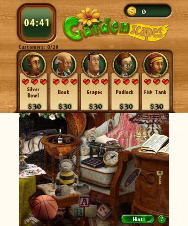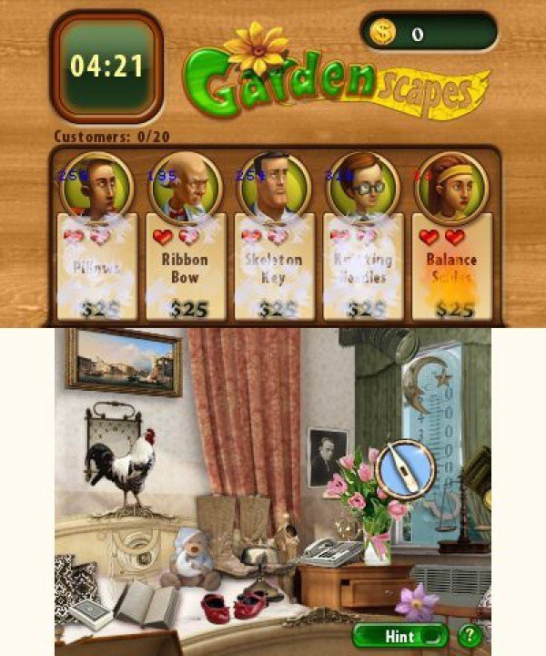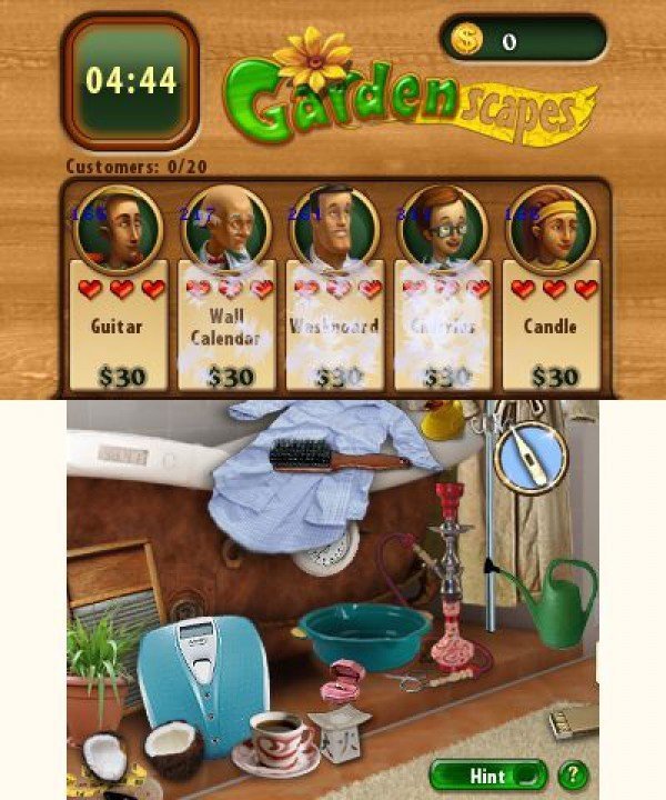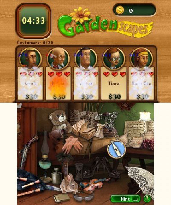 Signé Joindots, Gardenscapes n'est pas à proprement parler un jeu d'aventure pointer-cliquer, puisqu'ici il s'agit surtout de découvrir les objets cachés dans le décor, afin de créer le jardin de vos rêves. En effet, la mise en scène est assez originale pour une fois, et chaque fois que vous pénétrerez dans une salle, des personnages apparaîtront en haut de l'écran et seront prêts à dépenser une certaine somme d'argent pour se procurer tel ou tel objet. Évidemment, plus vous serez lent, moins la récompense sera importante. Une fois, un tableau terminé (il existe quinze décors différents sur la cartouche), vous pourrez investir la somme accumulée en accessoires pour votre jardin (des bancs, des haies, une niche voire même un étang), puis participer au concours "Le meilleur jardin". Comme à l'accoutumée, les décors rencontrés sont un capharnaüm assuré, mais il va falloir fouiller partout pour dégoter les objets qui permettront d'obtenir la récompense suprême. Si la progression peut sembler un peu austère, le scénario est plutôt bien construit. Cependant, aucun dialogue n'est présent sur la cartouche, mais des lignes et des lignes de textes défilent sur les écrans, écrans qui demeurent fixes au demeurant.