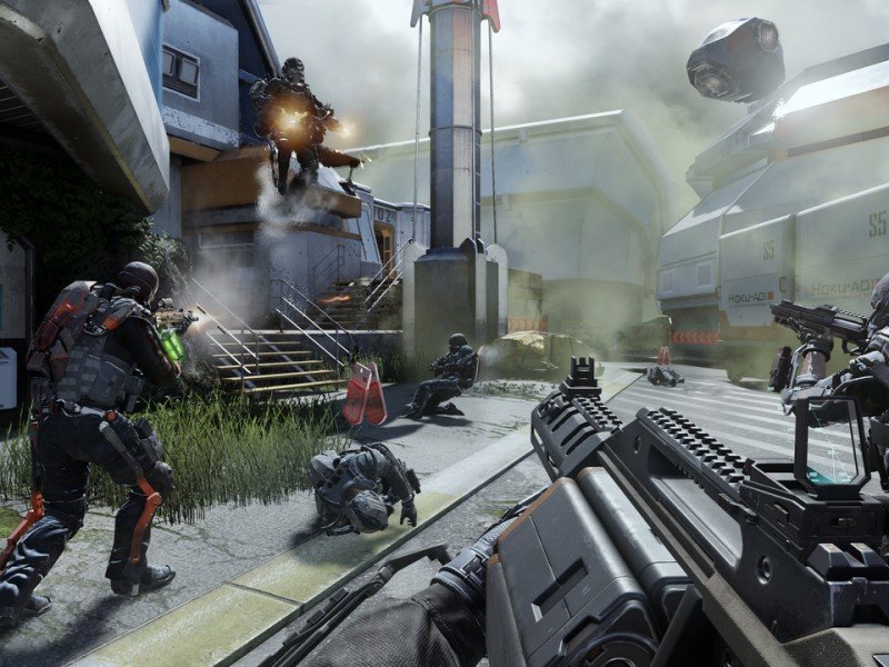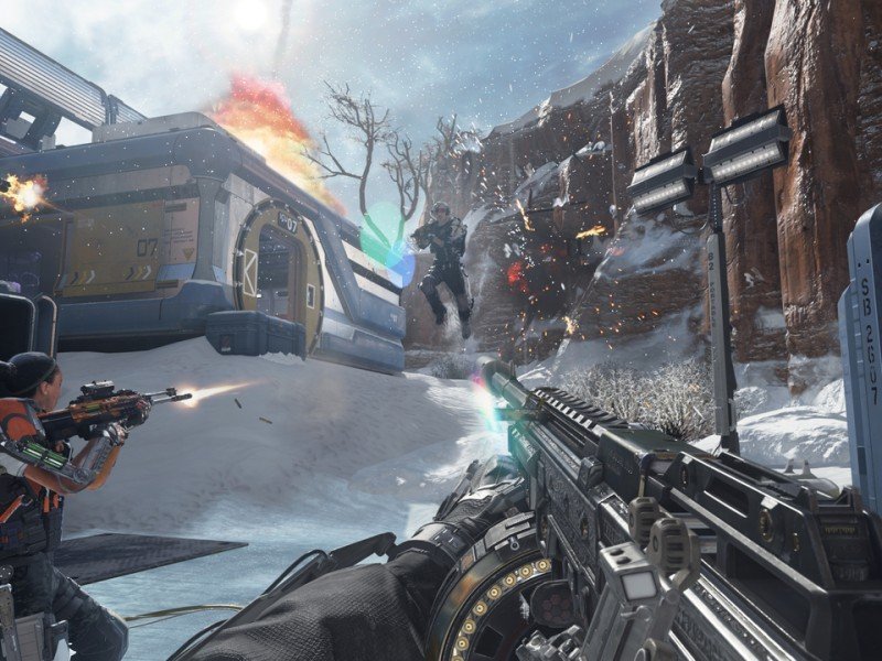 Le jeu propose également un mode coopération, ainsi que de multiples options multijoueurs sur Xbox Live (deathmatch, capture the flag, domination, etc ...). Parmi les ajouts proposés, on citera l'option Classique qui permet de s'affronter sans exosquelette, le Pick 13 (qui remplace le Pick 10 de Black Ops II) et qui offre la possibilité de tester des dizaines de combinaisons possibles pour votre équipement, le Combat Readiness Programme (sorte d'initiation au multijoueurs) qui propose des combats avec ou sans bots, le stand de tir qui est utile pour tester les modifications de votre EXO, l'apparition de butins que l'on gagne aléatoirement selon nos actions, un mode Survie assez anecdotique, mais aussi et surtout l'Uplink (chaque équipe dispose d'une zone de but, et les deux factions doivent récupérer un objet au milieu de la carte afin de l'expédier dans le but adverse), et Momentum (capture successive de zones de conflit). En tout, treize cartes sont présentes (une supplémentaire si vous avez acquis le Season Pass), et les différentes classes pourront être naturellement personnalisées. Les options sont toujours plus nombreuses, et dans les clans, il est possible de se défier pour le contrôle de la carte (la progression peut être suivie sur smartphones et tablettes grâce à une application COD).