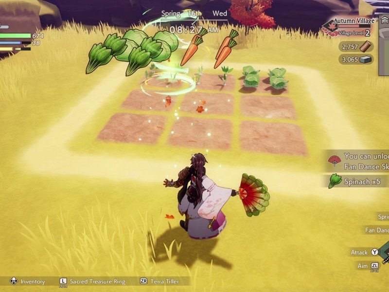 Envoyé en tant que Danseur de Terre , votre personnage est chargé de ranimer les arbres morts du Fléau en dansant près d'eux. Appuyez simplement sur le bouton A ou X près d'un arbre mort pour qu'il refleurisse. Cette action de danse permet non seulement de ranimer les arbres morts, mais aussi de les utiliser en combat. Il existe plusieurs types de Fléau à détruire ici, qui nécessitent différents outils. Au début, vous ne disposez que de bâtons de bambou et de tambours. Au fil du temps, ces outils de danse se multiplieront, comme les épées de feu, les éventails et autres. Par conséquent, vous devrez faire de nombreux retours en arrière lorsque vous disposerez d'outils plus complets. Tout comme les autres jeux Rune Factory, Gardians of Azuma possède un système de calendrier basé sur les saisons, chacune composée de 30 jours. Le jeu commence au printemps, se poursuit jusqu'à l'été, puis l'automne et enfin l'hiver. Avec autant de jours à parcourir, il est bien sûr nécessaire de prévoir des activités annexes pour ne pas s'ennuyer trop vite. Ce jeu propose de nombreuses activités au village : agriculture, construction, missions secondaires, quêtes de Bond, pêche, baignades dans les sources chaudes, etc. Si vous avez besoin d'un moment de détente loin de l'agitation de l'histoire principale, nous vous recommandons vivement ces activités secondaires. Dans le village, vous trouverez un terrain vide que vous pouvez aménager avec des objets tels que des bâtiments, des décorations, des routes, et même des terres et des graines. La simulation agricole du jeu précédent a été intégrée à une nouvelle fonctionnalité appelée « Construction de village » .