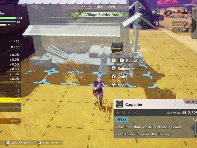 Pour créer de nouveaux bâtiments ou objets, vous avez généralement besoin de recettes obtenues lors d'aventures, en trouvant des statues de grenouilles ou en accomplissant des quêtes. Ensuite, vous pouvez vous adresser à un PNJ nommé Takumi pour créer ces objets à partir des matières premières demandées. Lorsque vous entrez dans le mode Construction de village avec le bouton ZR ou que vous équipez un objet appelé Terra Tiller , le temps du jeu s'arrête pour que vous soyez libre d'organiser, de créer, d'organiser, de déplacer des objets sur le terrain fourni sans avoir à vous soucier de manquer de temps ce jour-là . Sur ces terres, on trouve initialement beaucoup de déchets, tels que des pierres, du bois, des mauvaises herbes, etc. Vous pouvez les nettoyer avant d'y déposer les objets souhaités. La construction de ce village est assez addictive, surtout pour ceux qui souffrent de TOC, car vous devrez constamment relever le défi de créer un village de rêve, doté de toutes les installations nécessaires et agréable à regarder. Ah oui, après avoir créé une ferme et un magasin, vous pouvez embaucher des villageois pour gérer la simulation comme il se doit. Par exemple, vous pouvez demander au PNJ A de surveiller l'épicerie, au PNJ B de surveiller la forge, ou encore au PNJ C de s'occuper de la ferme, afin de ne pas vous fatiguer à planter et arroser vos plantes tous les jours.