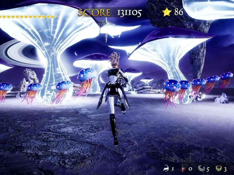 Sur le plan du jeu, malgré les presque quatre décennies qui nous séparent du Space Harrier original, Air Twister présente peu de révolutions, certainement pas nécessaires quand on se retrouve en présence d'un concept toujours vert. La structure sur rail restant inchangée, nous devrons exploiter la motricité d'Arch pour éviter les balles, tout en essayant simultanément d'utiliser notre blaster pour éliminer les différentes vagues ennemies, jusqu'à atteindre les boss finaux. Ceux-ci nous attendront à la fin de chaque niveau, et se caractériseront par de très grandes dimensions, de manière à couvrir souvent une grande partie de l'écran, ainsi qu'à présenter toujours différents types d'attaques. Les power-ups achetables dans le menu principal (nous ne pourrons en équiper qu'un à la fois) vont un peu mélanger les choses et pourront apporter des protections supplémentaires et des bonus passifs, utiles pour faciliter notre sortie. Il n'y a pas grand chose d'autre à dire sur le mode principal d'Air Twister , qui n'est rien de plus qu'une version plus moderne du gameplay de Space Harrier : à prendre ou à laisser. Cependant, comme mentionné précédemment, l'expérience de jeu ne s'arrête certainement pas là, étant donné que Suzuki-san a jugé bon d'inclure une grande quantité de mini-jeux accessoires, ainsi que des modes secondaires. En gros, vous retrouverez les traditionnels boss rush, time Attack, mode arcade et bien plus encore, le tout accompagné de défis hebdomadaires et quotidiens, utiles pour augmenter notre butin d'étoiles. Ce qui ressort, à la fin de l'analyse, est un mélange immédiat et insouciant qui parvient à offrir un bon défi et un plaisir à l'ancienne qui reste toujours solide.