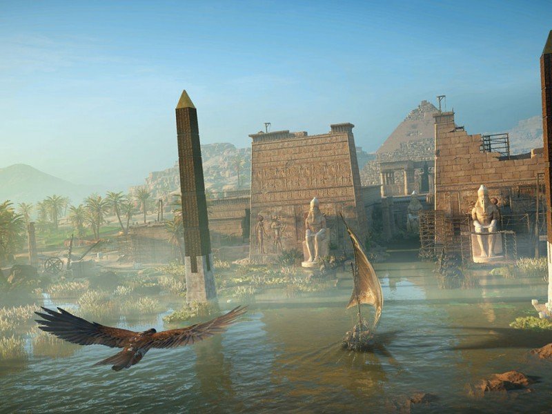Bayek pourra accumuler de l'expérience tout au long du jeu selon ses actions : Synchroniser un point de repère, éliminer des ennemis, compléter des missions, piller des trésors, découvrir des lieux, résoudre des énigmes, etc. De quoi améliorer à terme votre puissance et votre santé, tandis que le passage de niveaux vous donnera des points d'aptitude à dépenser afin de devenir un meilleur chasseur, un meilleur guerrier et/ou un meilleur assassin. Le côté RPG en ressort forcément grandi. Votre niveau vous permettra aussi de vous comparer aux défis à surmonter et ainsi déterminer si vous avez la puissance nécessaire pour compléter un objectif. En développement depuis quatre ans, cet opus apporte plusieurs nouveautés, la première étant d'évoluer dans un monde ouvert (12km²) truffé de quêtes secondaires et de multiples éléments à glaner pour améliorer son équipement ou sa résistance physique. Le jeu introduit également Senu, un aigle de Bonelli qui accompagne Bayek dans sa quête. Le héros se servira des yeux de l’animal pour repérer ses cibles à distance, vous conférant un indéniable avantage tactique sur le terrain. Au fil de votre odyssée Sensu pourra aussi être amélioré afin, notamment, d'étourdir des ennemis ou encore pour accentuer sa perception. Les développeurs d'Ubisoft Montréal nous livrent une reconstitution méticuleuse des panoramas de l'Égypte ancienne grâce au concours d'historiens spécialisés dans cette période. La liberté de déplacement est quasi totale et il ne devrait pas être compliqué de jouer au jeu du chat et la souris au cœur de l'Egypte ancienne. Ubisoft a également intégré de multiples objectifs annexes, missions, points de contrôle à synchroniser, camps à détruire, courses, trésors à piliers, bref de quoi remplir cet univers et proposer un concept qui se rapproche beaucoup de Ghost Recon Wildlands.
