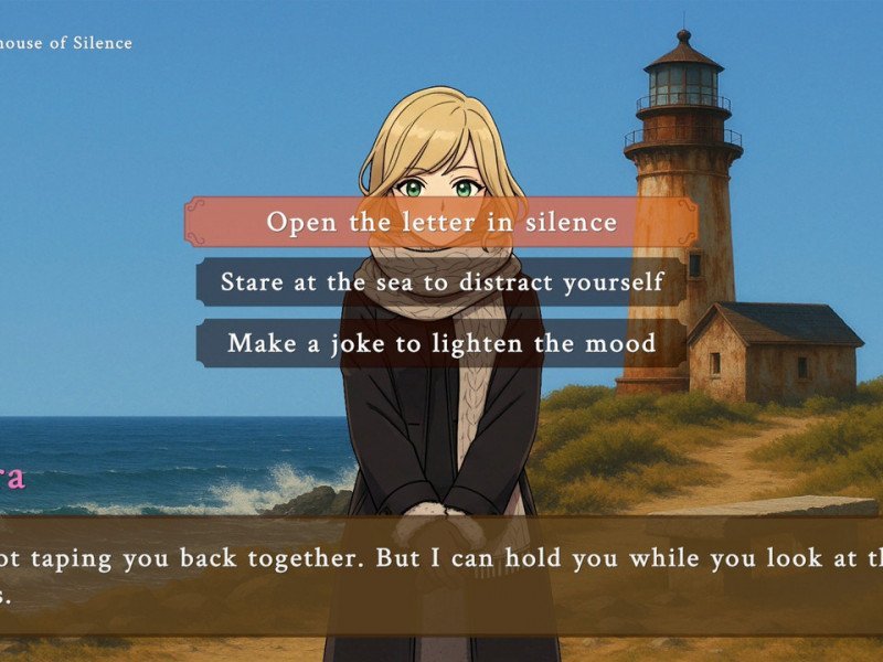 En termes de gameplay, Winterlight – Where Silence Says It All est un roman visuel classique où l'interaction se limite au défilement de texte et à la prise de décisions ponctuelles. Le jeu propose trois fins, sans qu'il y ait de fin positive ou négative ; il s'agit simplement d'un effet de « portes coulissantes », où chaque décision mène à une fin spécifique. En réalité, la décision finale, la plus importante, n'est pas prise par le joueur, mais déclenchée automatiquement en fonction de ses actions précédentes. Le gameplay est résolument classique, mais alourdi par une histoire très courte. Il en résulte peu de choix et une progression assez prévisible. Découvrir l'évolution de l'histoire reste intéressant, mais la quantité de contenu est décevante, surtout comparée à celle de ses concurrents. Quant à l'interface, elle est très classique. Outre la possibilité de sauvegarder à volonté dans plusieurs emplacements, vous pouvez réécouter certains dialogues ou consulter l'historique. Graphiquement , l'équipe a admis que Winterlight – Where Silence Says It All utilise l'IA comme système d'assistance et que toutes les images ont été retouchées manuellement. Malheureusement, le résultat est décevant. Tout d'abord, chaque capture d'écran trahit le système de production automatique de l'IA, désormais surutilisé, et pire encore, les erreurs typiques de ce type de production n'ont pas été corrigées.