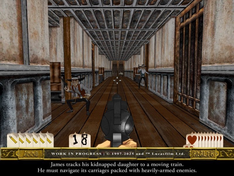 Quand on parle de LucasArts , on pense immédiatement aux jeux d'aventure graphiques créés par le studio au fil du temps, des titres entrés dans la légende grâce à leur scénario, leur humour et, bien sûr, leurs énigmes. Cependant, ce n'est pas le seul genre exploré par le studio durant son âge d'or : nous découvrons aujourd'hui la réinterprétation par Atari et Nightdive Studios de l'un des FPS les plus appréciés des années 90, Outlaws , dans cette version complète et soignée enrichie de « The Handful of Missions » , les missions supplémentaires gratuites sorties l'année suivante. Mais ce n'est pas tout ! Présentées de manière originale, malheureusement sans le format 16:9, les vidéos nous plongent directement dans l'intrigue d'Outlaws. L'ancien shérif James Anderson vit désormais paisiblement avec sa femme et sa fille dans une ferme en périphérie de la ville, au cœur du Far West. Cependant, sa maison et ses terres attirent l'attention d'un riche propriétaire terrien, Bob Graham , bien décidé à les acheter pour les revendre à prix d'or et financer ainsi la construction d'une voie ferrée. Cependant, « le Docteur », l'un des hommes de main de Graham, après le énième refus de la famille de vendre les terres, perd la tête – pour ainsi dire – et, pendant que James fait des courses en ville, lui et son homme de main assassinent Anna, l'ancienne épouse du shérif , et kidnappent sa fille, Sarah . Commence alors la traque impitoyable d'Anderson pour récupérer sa fille, qui reste son objectif principal, mais à laquelle s'ajoute la vengeance, puis un sens des responsabilités… car après tout, « un homme de loi est toujours un homme de loi » , aussi réservé soit-il.