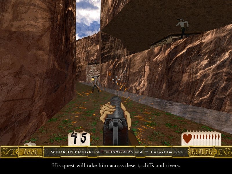 En 1997, LucasArts a utilisé une version modifiée du Jedi Engine pour développer Outlaws , le moteur presque entièrement 3D qu'il avait déjà employé deux ans plus tôt pour Star Wars: Dark Forces (avec un succès honorable). On retrouve ici toute la splendeur de cette époque, mais avec des graphismes bien plus lumineux et un rendu plus abouti. Ce remaster a en effet été créé grâce au moteur KEX de Nightdive , l'un des meilleurs pour la réinterprétation de titres classiques. Mais ce qui nous est proposé, c'est la cerise sur le gâteau : une reconstitution texturée de tous les environnements, modèles d'armes et ennemis, à partir des illustrations conceptuelles originales retrouvées dans les archives . La fidélité est donc extrêmement élevée, sans compromis sur la qualité ni sur la nostalgie. De plus, plusieurs bonus raviront les joueurs les plus exigeants : Outlaws + Handful of Missions prend en charge la 4K à 120 images par seconde , offrant ainsi une fluidité d'image exceptionnelle. Les cinématiques ont également été restaurées, même si, comme mentionné précédemment, elles n'ont pas été converties au format 16:9 — un peu dommage, mais la qualité du travail justifie largement ce défaut. Clairement, il ne s'agit pas d'un remake : attendez-vous à retrouver exactement le même jeu qu'en 1997, mais avec une meilleure réactivité des commandes, des graphismes plus nets et, bien sûr, quelques fonctionnalités supplémentaires appréciables, notamment un mode multijoueur jouable en ligne et en réseau local.