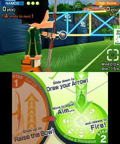 Comme son nom le suggère, DualPenSports se joue avec deux stylets, mais pas simultanément (l'écran tactile de la 3DS étant résistif et non capacitif). Deux stylets verts sont d'ailleurs inclus dans le packaging du jeu. Bref, cette compilation regroupe sept disciplines différentes (ski, tir à l'arc, parapente, basket, football, boxe et baseball), comprenant chacune deux épreuves où il faudra donc alternativement se servir de sa main droite et de sa main gauche. Cependant, le rythme de l'action s'avère souvent assez soutenu, obligeant à griffonner l'écran tactile dans tous les sens. Mais la prise en main n'est pas forcément des plus confortables, surtout pour les joueurs nomades puisqu'elle oblige à laisser la 3DS posée sur une table lorsque vous jouez. Comme c'est souvent le cas dans ce genre de titres, l'intérêt de DualPenSports varie selon les épreuves. Le tir à l'arc est ainsi assez aléatoire, alors que la boxe s'avère assez intuitive. Un mode "Entraînement Toucher" permettra de se familiariser avec la maniabilité, et de tester sa "doigilité" sur trois activités spécifiques.