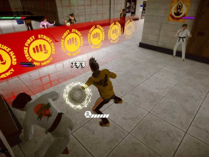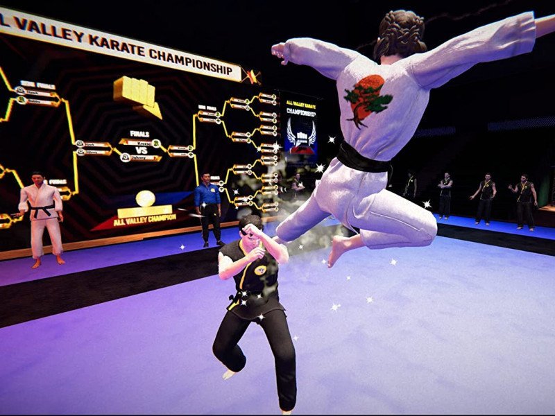 Pad en main après la phase initiale, on s'aperçoit immédiatement que les trois campagnes solo sont toutes structurées de la même manière : recruter de nouveaux membres pour le " dojo ", participer au Tournoi et prouver aux écoles rivales qui est le meilleur. Certes, certains niveaux diversifient légèrement la formule de jeu, mais dans l'ensemble, les trois campagnes se déroulent à travers une série de niveaux répétitifs et monotones où le joueur est engagé dans des combats, des courses et des dialogues pour convaincre des recrues potentielles de rejoindre le dojo. De nombreux combats ont lieu au cours des différents niveaux, mais malheureusement, beaucoup d'entre eux sont mal structurés car ils prennent beaucoup de temps à terminer et à être terminés, le tout soutenu par un compartiment d'animation ridicule et loin d'être acceptable. La pauvreté structurelle de Cobra Kai 2 : Dojos Rising n'est pas atténuée par le grand nombre de joueurs que l'on peut débloquer en remplissant divers objectifs. L'idée de proposer une variété de combattants est intéressante car elle permet au joueur d'affronter le titre avec différents personnages dans les diverses difficultés du jeu, mais malheureusement leur caractérisation est si simple et triviale que leur présence est inutile, limitant l'expérience de jeu à un constant button mashing sans condition de logique.