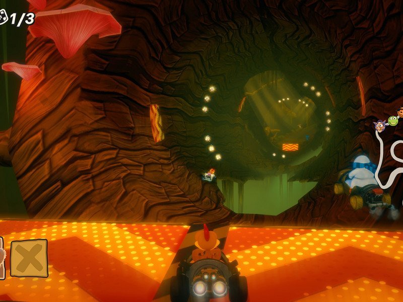 Les commandes sont précises et réactives, ce qui profite aussi bien aux débutants qu'aux joueurs expérimentés. La mécanique de drift rappelle beaucoup Crash et est absolument indispensable pour terminer dans les premières positions, en particulier sur les pistes avec des virages serrés. Le niveau de difficulté augmente modérément contre le CPU, vous permettant de vous améliorer en permanence et peut parfois être un véritable défi, ce qui n'est pas toujours le cas avec d'autres jeux. Par rapport aux autres représentants du genre, il est également à noter que le jeu met particulièrement l'accent sur les power-ups fous dont le poids classique deseize tonnes, assurent des courses chaotiques et rappellent l'imprévisibilité de Mario Kart, mais avec la différence que vous pouvez toujours emporter deux power-ups avec vous, et l'ordre de ceux-ci peut également être modifié, car tous les power-ups ne sont pas vraiment utiles dans toutes les situations. Graphiquement, le jeu se présente dans un style bande dessinée révisé qui souligne l'atmosphère humoristique. Les environnements colorés rendent hommage à l'histoire de la série ainsi qu'aux personnages invités, même si l'utilisation de la technologie moderne est perceptible, rien ne semble vraiment à la hauteur des standards actuels. La bande sonore est entraînante et s'adapte parfaitement au rythme rapide des courses, tandis que les effets sonores, tels que le rugissement des moteurs, soulignent acoustiquement l'action.