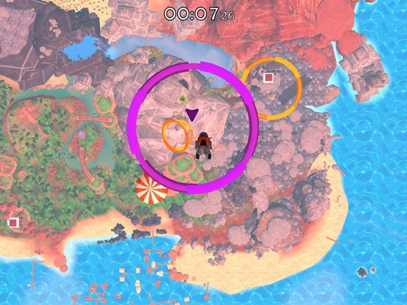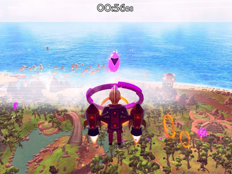 Pilot Sports tourne sur le moteur Unity et affiche également une réalisation technique qui rappelle les productions Wii, mais à la sauce HD, pardon 4K. Les développeurs ont créé une île amusante à survoler et qui possède une jungle luxuriante, des canyons et des ruisseaux cachés, des falaises abruptes propices à la montée en puissance du jet-pack, ainsi que de nombreux sites sympathiques tels que des phares et des ruines de temples. Les parcours sont intelligemment conçus pour montrer des côtés très différents de l’île, même si la diversité des environnements est quelque peu entachée par une technique très en deçà de ce qu'est en mesure d'afficher une PS5. Excepté un léger lissage depuis la mouture Switch et une résolution un peu plus élevée, les différences avec la console hybride s'avèrent mineures, il n'y a d'ailleurs pas d'optimisation PS5 Pro à la clé. La modélisation des personnages constitue le plus gros écueil, heureusement vous n'aurez pas à les regarder souvent de face, alors que les textures manquent de cohérence et l'absence d'éclairage dynamique donne un air de plastique aux décors traversés. Alors pourquoi ce portage tardif ? Tout simplement parce que Pilot Sports 2 sortira durant l'été 2025 sur consoles.