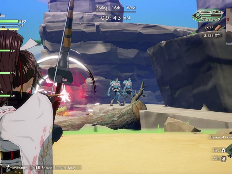 L'un des points faibles de Rune Factory 5 résidait dans sa section exploration, et Marvelous ne reproduit pas cette erreur. Guardians of Azuma a corrigé ce problème en offrant un espace d'exploration assez vaste. Bien que le monde ne soit pas aussi vaste que Breath of the Wild, ce jeu propose un système de carte du monde similaire à celui des anciens JRPG, où vous chevaucherez un dragon. Au cours de votre exploration, vous pourrez récolter diverses matières premières en abattant des arbres, en extrayant des roches ou en récupérant d'autres objets. Vous pourrez également trouver des statues de grenouilles disséminées sur la carte ou simplement balayer la terre devant le temple. Ce que nous apprécions le plus dans l'exploration, c'est le système de voyage rapide depuis le point de sauvegarde, qui réduit le temps de trajet pour atteindre un point déjà franchi. C'est très pratique pour terminer les quêtes inachevées. En termes de combat, le système reste identique à celui du précédent Rune Factory : simple mais toujours efficace. Votre personnage peut porter deux types d'armes simultanément, que vous pouvez changer en cours de combat. Chaque arme possède des animations d'attaque différentes : épées courtes, épées longues, épées jumelles, amulettes à lancer ou arcs et flèches. Nouveauté : une troisième arme, le Trésor sacré , est disponible et peut être déclenchée avec la touche Y. Ce trésor a plusieurs fonctions, comme déclencher des attaques élémentaires et restaurer des points de vie. Cependant, pour l'activer, les points runiques (RP) sont sa principale ressource. Vous ne combattrez pas seul ici, car vous pouvez inviter trois PNJ du village à rejoindre votre groupe. Ces personnages ont chacun leur rôle : Attaquant, Amortisseur, Debuffeur, Soigneur ou Défenseur. Ils jouent leurs rôles avec beaucoup d'ingéniosité, ce qui vous aidera grandement pendant le combat. Cependant, la difficulté finale est facile, ce qui permet de terminer rapidement le combat contre le boss.