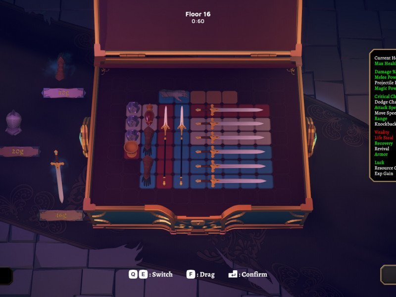 Le système de combat est donc extrêmement similaire à celui d'autres œuvres, comme Keeper's Toll, récemment testé, malgré quelques différences notables. Si le système de combat automatique reste le même – c'est-à-dire que les armes que l'on équipe progressivement agissent de manière autonome, frappant les ennemis en fonction de leurs priorités et de leur portée –, on retrouve également un nouveau système de gestion d'inventaire . Ou plutôt… inédit pour ce type de titre, puisque la structure du gameplay est empruntée textuellement à Resident Evil , et plus précisément au quatrième volet. Après chaque arène, nous aurons l'occasion essentielle de gérer notre inventaire, composé d'une série de cases. Ces cases peuvent augmenter en nombre à mesure que nous gagnons des niveaux en éliminant des ennemis. Plus de cases, plus d'espace pour stocker des objets. Quels objets ? Des armes, de l'équipement défensif et bien plus encore. Chaque objet a un coût, et les pièces , comme l'expérience, doivent être gagnées sur le champ de bataille. De plus, chaque objet occupe un espace spécifique, qui se traduit par un nombre de cases consécutives. Par exemple, une dague occupe trois cases en ligne droite, tandis qu'une petite faucille occupe trois cases plus une sur le côté pour sa pointe courbée. La gestion de l'espace est la base d'une configuration efficace qui nous permettra d'atteindre le boss final tant convoité.
