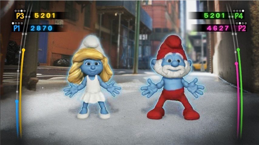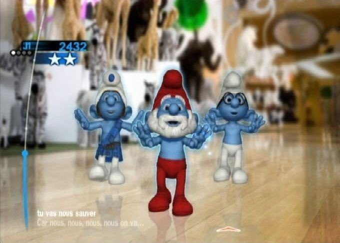 Comme sa couverture le suggère, Les Schtroumpfs : Dance Party s'inspire du film de Raja Gosnel prochainement en salles. Oubliez donc les petits êtres bleus de Peyo, place à des personnages en 3D évoluant dans la ville de New York. Etrangement, les développeurs ont fait le choix d'en faire un titre de danse sur Wii, et de s'inspirer - ô surprise - du concept de la série Just Dance. Il suffira donc de tenir la télécommande Wii dans la main droite et de reproduire les mouvements que réalise le personnage à l'écran. En cas de succès, la jauge montera et permettra d'enchaîner les records. Mais le gameplay semble avoir été simplifié afin de s'adapter au jeune public, ce qui n'est pas vraiment une surprise. La reconnaissance des mouvements s'avère parfois très hésitante, et les mêmes pas reviennent encore et toujours. Nous sommes loin des chorégraphies parfois exubérantes de Just Dance 2. Les Schtroumpfs : Dance Party permet de se déhancher jusqu’à quatre simultanément sur de nombreuses musiques, 24 exactement. Mais le problème, c'est qu'on y retrouve presque uniquement des reprises (excepté One of the Boys de Katy Perry), ou bien des chansons en Schtroumpfs. Le résultat est assez mitigé. Dans les années 1980, on aurait pu trouver ça drôle, en 2011 non. Mention spéciale au morceau avec Gargamel tiens !