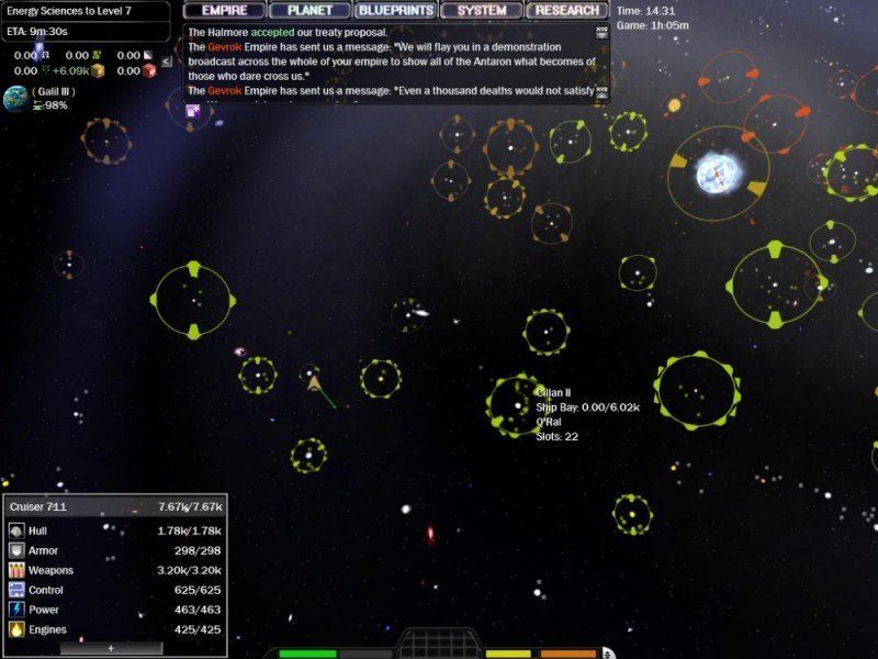 Star Ruler est un jeu de stratégie spatiale qui propose une ambiance de space opera assez réussie, et un système de combat plutôt dynamique. Naturellement, le système solaire de départ est pour le moins restreint et vous débuterez la partie sur un astre bien isolé. Cela sera l'occasion de découvrir l'interface, qui se montre cependant assez compliquée d'accès, surtout que la version de base du jeu est entièrement en anglais. Il existe une traduction française sur Internet, mais elle se révèle assez mauvaise et n'aide pas vraiment à comprendre ce que vous devrez faire. Explorer les planètes sera donc votre passe-temps favori, surtout qu'outre mettre la main sur ses ressources, vous pourrez les coloniser et construire tout ce dont à besoin la population pour prospérer. Evidemment, vous ne serez pas à l'abri de l'arrivée d'un ennemi, auquel cas il faudra alors prendre des mesures. Technologiquement parlant, votre attirail n'est pas non plus toujours adéquat. Pour certains astres, vous aurez besoin d'améliorations pour votre vaisseau. Comme d'habitude dans un RTS, ce sera donc votre clan qui sera chargé de les développer. Et comme vous gagnerez de l'expérience au combat, vous pourrez rapidement mettre sur pied une flotte redoutable pour vous accompagner.