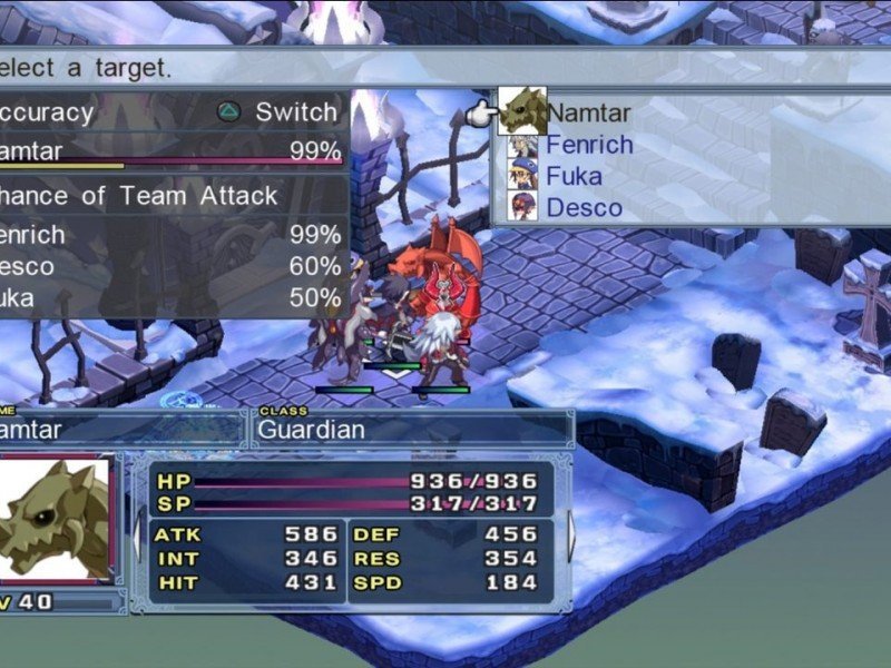 Le vampire Valvatorez mène une vie paisible dans le Sous-Monde, et se nourrit exclusivement de sardines (!). Cela n'a pas toujours été le cas, le personnage ayant eut un passé pour le moins tyrannique. Pourtant, suite à un kidnapping des fameux Prinnies, des pingouins bleus explosifs abritant l'âme des damnés, Valvotorez va regagner la surface, accompagné de son serviteur Fenrich. L'occasion d'une aventure pleine d'humour, où l'on rencontrera également de nombreuses connaissances pour les fans de Disgaea. Le concept lui n'a pas foncièrement évolué, et reprend les codes du tactical RPG façon Ogre Battle ou Final Fantasy Tactics. Les Geosymbols, responsables de pas mal d'attributs, et ces Dark Portals vous emmenant dans un monde parallèle d'où émane une forte énergie négative et où l'ennemi sera nettement avantagé. La première étape sera donc de créer son équipe et une fois que vous êtes prêt, foncez dans le portail inter-dimensionnel pour arriver dans la zone de combat. Comme les précédents épisodes, les combats se déroulent en 3D isométrique et au tour par tour. A vous d'utiliser votre armement et votre magie pour remporter la partie. Cependant il est utile de préciser que Disgaea 4 a été traduit en français, ce qui est un plus non négligeable pour un jeu du genre.