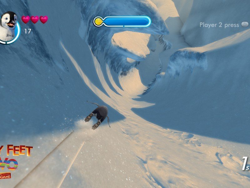 Mumble et Gloria ont désormais un fils, Erik, qui se bat pour découvrir ses propres talents dans le monde des manchots empereur. Mais de nouveaux dangers menacent la nation des manchots, et tous vont se rassembler - et danser — pour les sauver. Happy Feet 2, le nouveau film d'animation de Warner Bros débarque donc sur PlayStation 3 dans un titre proposant diverses phases de gameplay. Le jeu de KMM Games reprend un scénario proche du film. A travers le regard de Mumble et Ramon (son meilleur ami), vous ferez connaissance avec Erik, un manchot pas vraiment doué pour la danse et qui a décidé de s'enfuir. Votre objectif sera donc de le retrouver dans un titre mélangeant plate-forme, rythme, et réflexion. La progression est entièrement balisée, cela va de soi, et il faudra obligatoirement récupérer un certain nombre de manchots pour terminer un niveau ou pour gravir certains obstacles. Il est bien entendu possible de passer dans la peau de Mumble ou Ramon à tous instants (un mode coopératif est d'ailleurs de la partie), et il faudra d'ailleurs compté sur les compétences des deux personnages pour résoudre quelques énigmes. Petite particularité du jeu, toutes les actions doivent se faire en rythme. Une écoute de la musique est donc nécessaire, et il sera requis de se coller à la mélodie pour progresser sans encombre et battre facilement les boss.