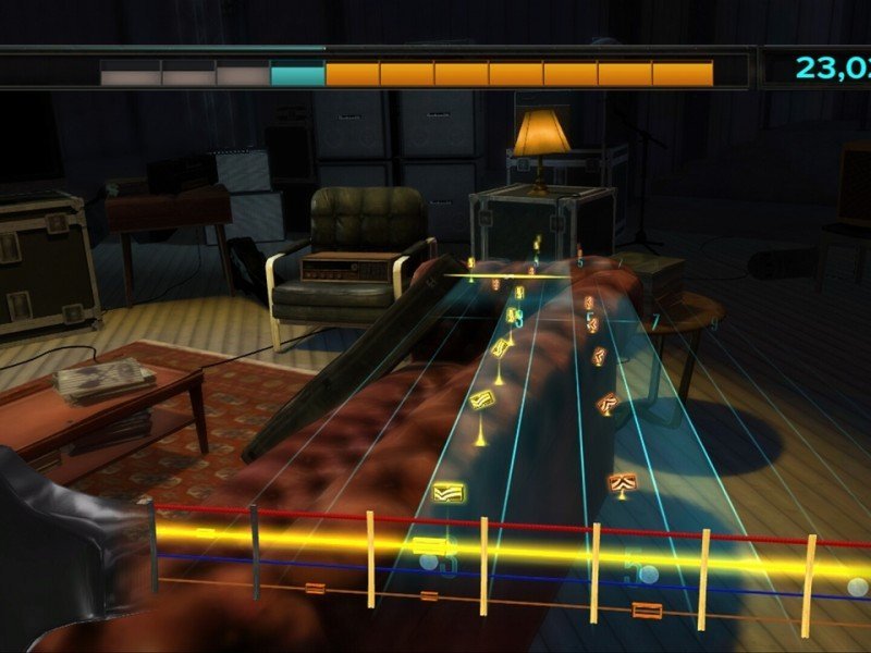 Développé par Ubisoft, Rocksmith n'est pas un jeu de guitare comme les autres. En effet, contrairement aux autres acteurs du marché, cette production ne requiert pas l'usage d'un instrument en plastique, mais d'une authentique guitare (ou basse). Le jeu débute par un très long tutoriel, destiné à vous expliquer comment vous servir d'un médiator, comment accorder son instrument, et puis enfin comment jouer une note. Dès que la partie débute, on retrouve un fonctionnement assez classique, avec les notes qui défilent vers l'écran, et qui doivent être exécutées au moment précis où elles arrivent sur le manche virtuel de la guitare. Chaque corde est symbolisée par une couleur différente et la ligne horizontale signale que la corde doit être grattée sans toucher au manche. Guitare en main, Rocksmith s'avère très progressif, il est vrai que dans les premiers morceaux vous n'aurez qu'à composer une poignée de notes. Selon votre prestation, le jeu s'adaptera à votre niveau, et meilleur vous serez, plus proche la partition sera de la réalité.