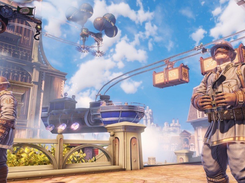 Même si le contexte politique et social est important, BioShock Infinite n'est pas pour autant inaccessible. Les mécaniques reprennent globalement les mêmes recettes que dans les précédents volets, et la structure reste linéaire. Bien sur, en sortant des sentiers battus, vous pourrez découvrir des journaux audio à collecter et des films en noir et blanc, permettant de mieux comprendre la fonctionnement de la société. Le système de combat a été légèrement remanié, et la prise en main est plus réactive. Les plasmides sont également de retour, cette fois sous forme de toniques créés par Fink Manufacturing, et font preuve d'une plus grande variété. On appréciera particulièrement la télékinésie, qui permet désormais d'attirer les ennemis vers soi afin de les laisser léviter pour ensuite les frapper en utilisant le tonique de charge. L'armement est assez colossal, et s'il est seulement possible d'en transporter deux à la fois, on ne manque jamais de stratégie pour rosser nos adversaires. On signalera également la présence d'un petit bouclier qui se rechargera automatiquement (ô surprise), mais aussi d'un crochet aimanté qui permet de se déplacer rapidement à travers l'environnement ou d'attaquer l'ennemi à travers les airs.