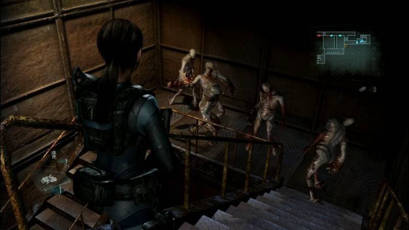 Malgré quelques errements du côté du design des personnages, Resident Evil Revelations peut se vanter d'offrir une réalisation graphique assez convaincante. Ce passage à la haute définition embellit l'ensemble, même si quelques détails trahissent les origines nomades du jeu. L'ambiance se montre pour le moins éclectique, même si l'aventure se déroule essentiellement en pleine mer. On aura également plaisir de retrouver les monstres emblématiques de la série, accompagné de petits nouveaux engendrés par le terrifiant T-Abyss. Vous ne serez troublé par aucun bandeau chargement à l'écran durant les missions, Capcom ayant décidé de les dissimuler. Lorsque vous emprunterez un ascenseur ou changerez de compartiment sur le bateau, le jeu peut se mettre sérieusement à ramer. Il est donc conseillé de rester immobile durant ces séquences "intermédiaires". La jouabilité reprend quant à elle le schéma de contrôle des épisodes 4 et 5, avec quelques petits ajustements. Bonne nouvelle, il est permis de se déplacer tout en tirant, même si l'ensemble demeure un brin rigide, en tout cas davantage que dans RE 6. On retrouve quelques séquences d'actions interactives (QTE) et la possibilité de faire rapidement un 180°. On pourra par contre regretter le manque de lisibilité de la carte du jeu. Il est parfois très difficile de trouver sa destination, quand bien même vous seriez situé juste à côté.