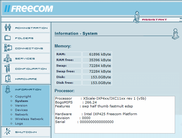 Voici donc les informations qui nous manquaient, le processeur et la RAM, car pour faire tourner tout cela, il faut que cela tienne un tant soit peu la route. Le processeur est un XScale cadencé à 266Mhz et comme mémoire on a exactement 62MB. De quoi faire tourner un petit site mais pas pour accueillir un forum phpBB c'est sûr.