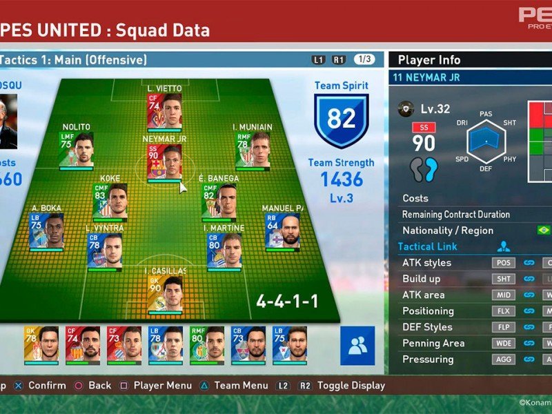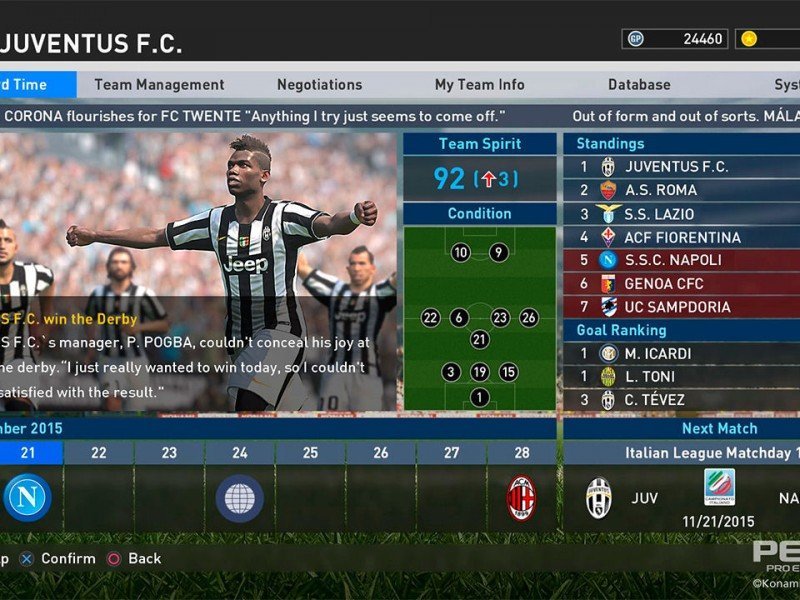 Malgré une interface reliftée, PES 2016 comporte toujours les mêmes modes. Le MyClub est un mode Carrière en ligne très inspiré de ... FIFA Ultimate Team. Vous devez construire une équipe de A à Z et veillez à ce qu'il n'y ait aucune tension au sein de votre effectif. Des zones de chaleur apparaissent sur l'écran tactique pour montrer les compatibilité de style entre les joueurs. Au fil de la progression, vous gagnerez des points GP, utiles pour recruter de nouveaux joueurs auprès des différents agents que comportent le jeu. Le hasard est pourtant une part importante de la partie, puisque chaque acquisition passe par un tirage au sort, et on ne sait jamais sur quel protagoniste on va tomber. Notons que des joueurs sont désormais exclusifs à ce mode, et qu'un système de niveaux a été ajouté. On appréciera également la présence de la Ligue 2 française entièrement licenciée, tandis que la Ligue des Champions, prestigieuse compétition européenne, est toujours présente, ainsi que la Ligue Europa et la Ligue des Champions Asiatique. Une fois de plus, on constatera que seulement une partie des clubs disposent des vrais noms de joueurs (notamment dans les deuxièmes divisions anglaises et italiennes qui font leur apparition). Les sempiternels problèmes de licence se posent donc toujours, mais si un effort évident a été fait (des mises à jours sont d'ailleurs planifiées). Le cœur du jeu restera naturellement la Ligue des Masters, sorte de mode carrière, qui permet de gérer une petite équipe et d'essayer avec elle d'atteindre les sommets. Le menu a été remanié et le système de transferts se montre plus accessible. Dans le Vers une Légende, vous aurez la possibilité d'incarner un joueur du début à la fin de sa carrière. Le mode en ligne est encore amélioré, et d'une ambiance sonore particulièrement soignée. L'option myPES permettra de communiquer avec vos amis, en liaison avec les réseaux sociaux (un widget apparaît en permanence-, afin de leur proposer des défis ou suivre leurs performances. Le Rival Ranking permettra de trouver des concurrents à son niveau, et il vous est possible de créer votre propre communauté ouverte, classée par régions, par pays, puis ville par ville.