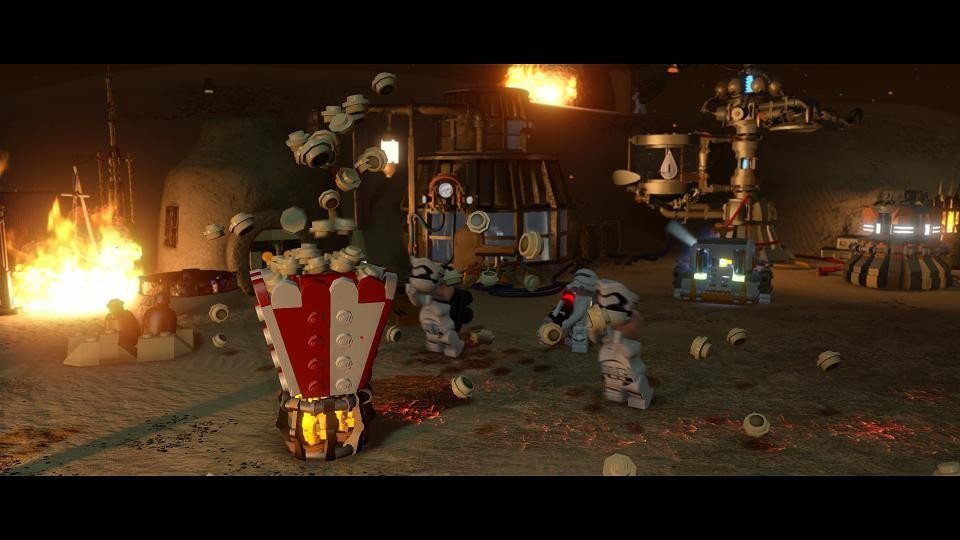 Le jeu affiche toujours une architecture en hub (à l'instar de LEGO Le Film par exemple) qui laisse la possibilité de revenir dans d'anciens niveaux, mais les environnements sont plus grands qu'auparavant (sans jamais égaler LEGO City Undercover en revanche). Vous pourrez visiter cinq destinations (D'Qar, Jakku, l'intérieur du Faucon Millénium, la base Starkiller et Takodana). Par ailleurs, un mode Libre est aussi présent et permet d'essayer les personnages bonus débloqués. Bien sur, l'univers demeure toutefois très bon enfant, une affaire de cible sans aucun doute, les LEGO s'adressant avant tout à un jeune public. Parmi les nouveautés de gameplay apportés, vous retrouvez cette fois les multi-constructions, qui permettent d'utiliser la même pile de LEGO pour plusieurs usages, en fonction d'une situation donnée (souvent un casse-tête), tandis que les batailles de blasters prennent une tournure action façon TPS. En pressant sur L2, votre avatar peut tirer sur les ennemis et pourra même se mettre à couvert pour éviter les tirs des hommes du Premier Ordre. La jouabilité manque de souplesse cela étant, le stick droit n'étant à aucun moment géré. Enfin, la partie permettra de piloter des véhicules emblématiques de Star Wars, comme le Faucon Millénium, dans des combats en arène et des batailles spatiales. Le résultat est plutôt arcade et encore loin d'égaler la trilogie Star Wars Rogue Squadron. PlayStation 4 oblige, le titre peut naturellement se jouer directement sur l'écran de la PS Vita, sans la télévision allumée, et profite d'un mode multijoueurs qui peut utiliser un affichage séparé (un joueur sur la TV, l'autre sur la Vita).