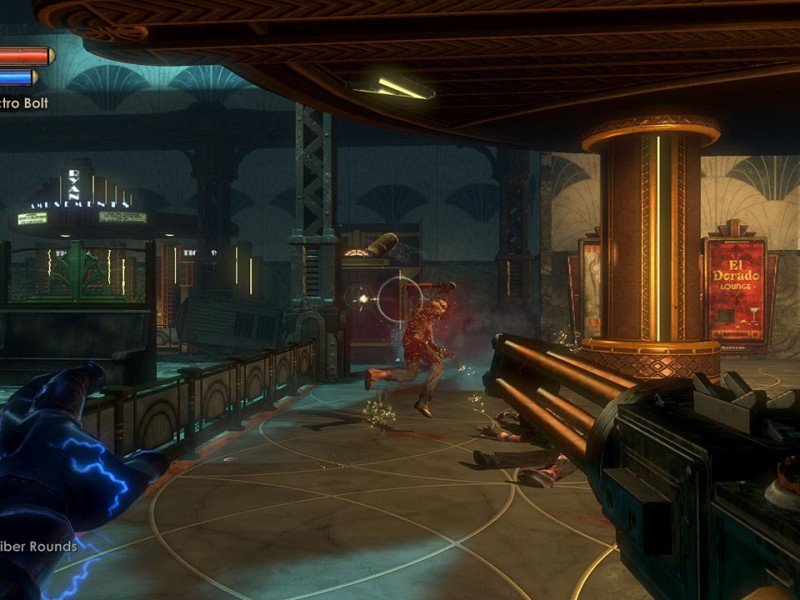 Même si le contexte politique et social est important, BioShock Infinite n'est pas pour autant inaccessible. Les mécaniques reprennent globalement les mêmes recettes que dans les précédents volets, et la structure reste linéaire. Bien sur, en sortant des sentiers battus, vous pourrez découvrir des journaux audio à collecter et des films en noir et blanc, permettant de mieux comprendre la fonctionnement de la société. Le système de combat a été légèrement remanié, et la prise en main est plus réactive. Les plasmides sont également de retour, cette fois sous forme de toniques créés par Fink Manufacturing, et font preuve d'une plus grande variété. On appréciera particulièrement la télékinésie, qui permet désormais d'attirer les ennemis vers soi afin de les laisser léviter pour ensuite les frapper en utilisant le tonique de charge. L'armement est assez colossal, et s'il est seulement possible d'en transporter deux à la fois, on ne manque jamais de stratégie pour rosser nos adversaires. On signalera également la présence d'un petit bouclier qui se rechargera automatiquement (ô surprise), mais aussi d'un crochet aimanté qui permet de se déplacer rapidement à travers l'environnement ou d'attaquer l'ennemi à travers les airs. Le personnage d'Elizabeth est très présent dans BioShock Infinite, et cette jeune femme vous accompagnera d'ailleurs pendant une grande partie de l'aventure. Au fil de l'aventure, vous la verrez exprimer différentes émotions, et ses traits ont volontairement été accentués pour renforcer l'immersion. Elle peut également se montre utile en ouvrant des portes et des coffres verrouillés, en vous confiant des munitions, du cristal ou des rations de soin durant les combats, ou encore de déchiffrer les codes mystères dans les quêtes secondaires. Enfin, Elizabeth pourra également créer des portails vers d'autres dimensions, ce qui permet de modifier considérablement son environnement.