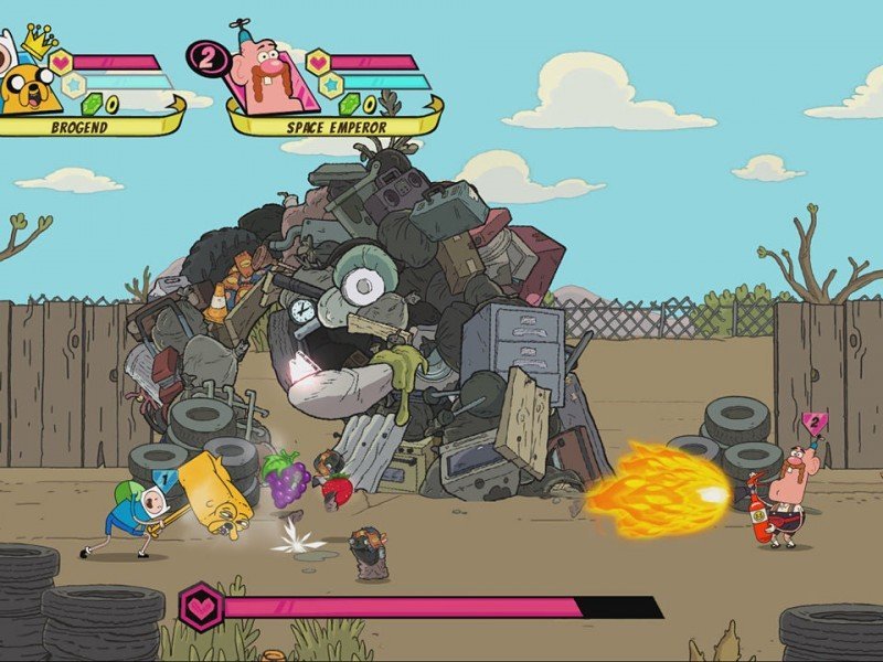 Développé par Magic Pockets, Cartoon Network : Battle Crashers est un jeu d'action regroupant six univers différents, à savoir Adventure Time, Clarence, Gumball, Regular Show, Steven Universe et Uncle Grandpa. C'est d'ailleurs ce dernier qui est à l'origine de ce cross-over, ayant pénétré dans une faille statio-temporelle avec sa caravane. Il va falloir rétablir l'espace et le temps à l'aide des héros des héros de chaque série, sachant que vous aurez deux niveaux et un boss pour chaque univers, et un total de six personnages (Gunball, Steven Universe, Finn, Mordecai, Clarence et Uncle Grandpa) présentant des compétences différentes. Ils disposent tous d'une attaque initiale, d'un saut, mais aussi de deux autres techniques déblocables lors des montées en niveau. Pour ce faire, il faudra récupérer des gemmes dans les différents environnements traversés, et aller jusqu'au level 3 pour avoir accès à toutes les compétences de base. La difficulté monte assez rapidement, et le jeu semble avoir été pensé pour pouvoir être parcouru à plusieurs tant le nombre d'ennemis à l'écran est important. Il est possible de jouer jusqu'à quatre sur une même console, et l'objectif est de réunir une équipe qui se complète bien. En solo, vous pourrez passer d'un personnage à l'autre via une simple presse de gâchette.