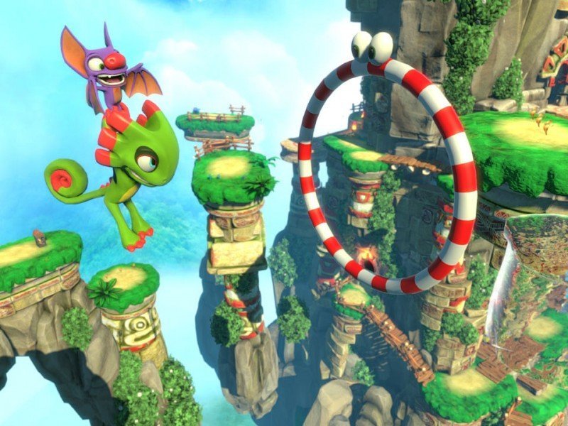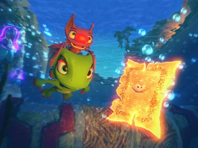 Fondé par des anciens de RareWare, le studio Playtonic Games nous livre Yooka-Laylee, un jeu de plates-formes titillant la fibre nostalgique des utilisateurs de Nintendo 64. En effet, le jeu s'inspire très fortement de Banjo-Kazooie, mettant en scène un duo de personnages fantastiques dans des environnements hauts en couleurs. Yooka (le caméléon vert) et Laylee (la chauve-souris blagueuse au gros nez) se lancent dans une quête pour retrouver les pages perdues d'un livre magique. Rapidement, ils seront confrontés au sinistre Capital B., un patron d'entreprise aux yeux exorbités voulant utiliser ce livre afin de mener à bien ses sombres desseins. Yooka a la même personnalité que Banjo tandis que Laylee est aussi bavarde que l'était Kazooie. Même les objets à ramasser au sein des mondes sont directement inspirés du jeu N64. Par exemple, les notes de musique ont été remplacées par des plumes, les pièces de casse-tête sont devenues des pages de livres, les cinq Jinjos cachés dans chaque monde ont laissé leur place à cinq écrivains mystérieux, les personnages peuvent se transformer de différentes manières, et on retrouve même des quiz similaires à ceux proposés par Gruntilda à l'époque. Seule modification, la difficulté a fondu comme neige au soleil, les vies étant illimité dans Yooka-Laylee.