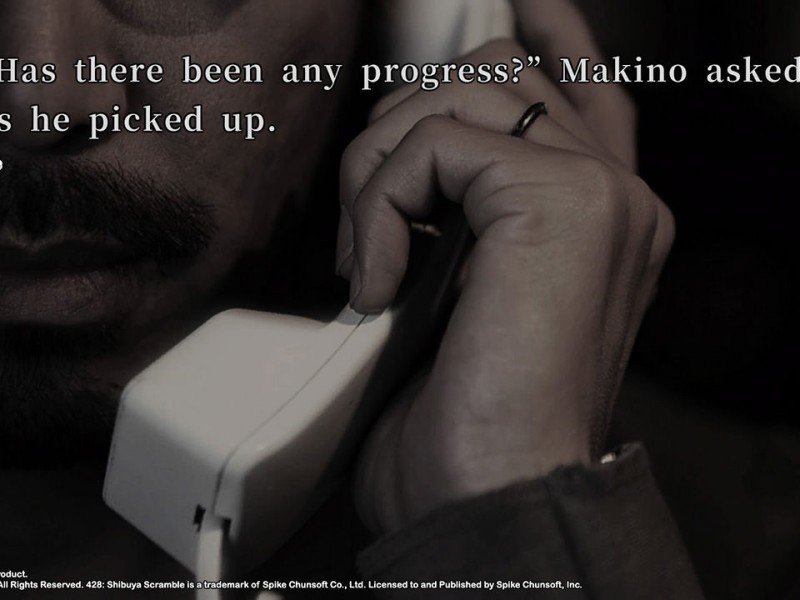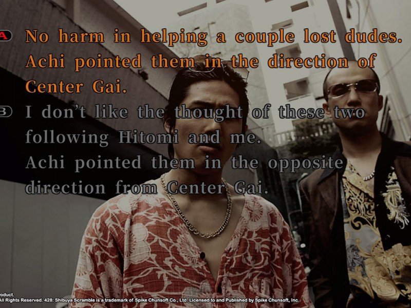 Développé par Chunsoft, 428 : Shibuya Scramble est le remaster d'un jeu paru sur Wii en 2008 au Japon et qui avait la particularité d'avoir obtenu la note maximale (40/40) dans le magazine Famitsu. Ce jeu d'aventure visuel novel nous entraîne dans les rues animées de Shibuya, l'un des quartiers de Tokyo, où un homme est attaché à l'arrière d'une voiture avec un sac sur la tête. Clairement, nous sommes face à une affaire de kidnapping qui va affecté cinq protagonistes principaux : Shinya Kano est un détective du département de police de Shibuya, Achi Endo est quant à lui un ancien chef de gang qui consacre désormais sa vie à nettoyer les rues (littéralement). Ces deux personnages se découvrent lors d'un tutoriel qui permet d'assimiler les ficelles du mécanisme de jeu principal, à savoir les chronologies parallèles. Après quelques minutes, il est facile de déclencher une mauvaise fin, sachant que le jeu en intègre plus de quatre-vingt-dix !
