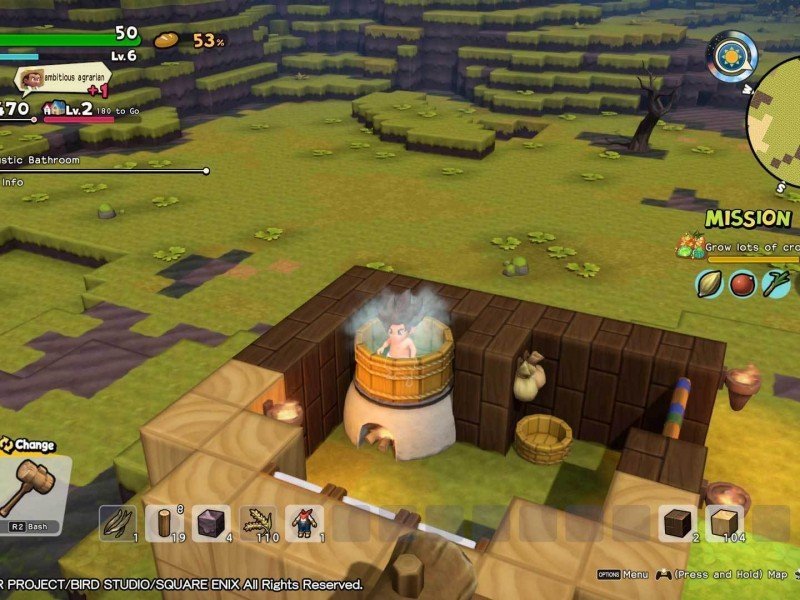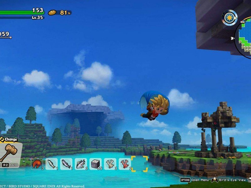 Dragon Quest Builders 2 propose également une gamme de nouveaux outils qui simplifient grandement les choses. Une flûte qui peut trouver des matériaux rares dans les montagnes, un arrosoir sans fond qui vous permet de transporter du liquide et de le verser où vous le souhaitez et d’autres éléments comme l’outil d’échange qui permet de remplacer un matériau par un autre. Se déplacer est également beaucoup plus facile car vous pouvez maintenant planer et profiter du vent, grimper au sommet d'une colline et sauter pour voyager à une vitesse deux fois supérieure et survoler les obstacles. Vous pouvez aussi vous déplacer sous l'eau, ce qui est une première dans la série. Mais la véritable vitrine du savoir-faire vient après que vous ayez terminé les principales îles et que vous vous dirigiez vers l’île de l'Éveil. C'est ici que tout ce que vous avez appris entre en perspective avec une quantité infinie d'exploration et de créativité. C'est votre terre et vous pouvez faire ce que vous voulez avec les choses que vous avez apprises à faire sur les îles que vous avez sauvées. Vous pouvez naviguer vers de petites îles et trouver de nouveaux matériaux, des semences et des outils rares et les ramener pour les utiliser dans votre dernière création. Heureusement, le jeu vous donne encore un peu d'indication, car l'île de l'Éveil est divisée en zones spécifiques telles que l'agriculture et les mines. Ce qui signifie que vous n'avez pas besoin d'être submergé par les options et vous demandez où construire quoi. Les citoyens que vous ramenez avec vous trouvent tous un endroit où travailler, et si vous construisez une ferme, ils y cultiveront. Une région était une terre en friche, mais avec suffisamment de temps et d’efforts, vous pouvez la transformer en une terre agricole animée avec de l'herbe luxuriante, plus de cent blocs de terre et assez d’espace pour que chacun puisse manger, dormir et même se laver. Vous pouvez ensuite y revenir après avoir déverrouillé des centaines de nouvelles créations sur la deuxième île et par exemple fabriquer une piscine. Tout le monde l'appréciait et cela se voyait par la quantité de cœurs laissés sur le sol, qui a servi de devise pour déverrouiller une nouvelle île à explorer et des recettes à élaborer.