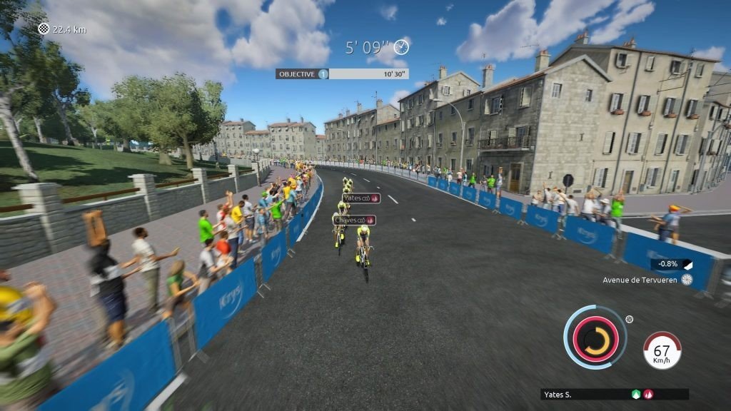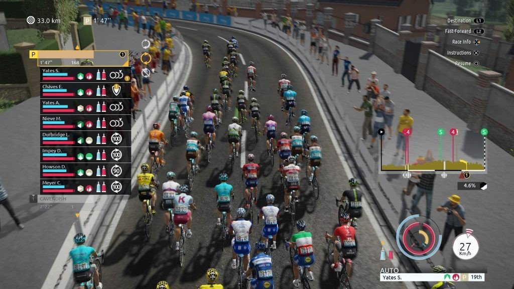 Si vous n'avez jamais joué à un match du Tour de France auparavant, vous feriez bien de faire le tutoriel au préalable, car il passe par toutes les mécaniques que vous rencontrerez tout au long de votre carrière de pilote. Les courses elles-mêmes sont assez relaxantes et si on les laisse se détendre sans avance rapide, on peut dire que ça devient un peu ennuyeux. C'est comme si vous regardiez une course en direct à la télévision, mais sans pause publicitaire et sans les missives des commentateurs qui remplissent l'action autrement silencieuse. Vous contrôlez votre sportif avec L2 (freins) et R2 (pédalant), X permettant de sprinter en selle, cela n’est pas vraiment plus complexe que cela. L1 vous permet de régler vos efforts pour éviter que votre coureur ne manque d'énergie prématurément. R1 vous met dans une rigidité aérodynamique, ce qui est utile en descente au moins. Dans les épreuves contre la montre par équipe, vous pouvez passer d’un coureur à l’autre avec O, ce qui vous permet de garder le rythme. Une stratégie valide dans la réalité.