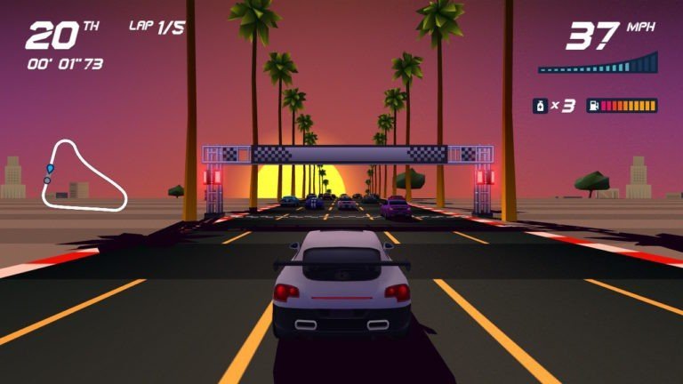 Développé par le studio brésilien Aquiris, Horizon Chase Turbo semble être une tentative de reconquérir la magie du jeu original Out Run des années 80, mais avec des graphismes 3D rétro. Horizon Chase Turbo est aussi simple que possible d'un point de vue gameplay : Il vous suffit de prendre le volant de plusieurs modèles de voitures sans licence (mais facilement reconnaissables), et de parcourir plusieurs circuits autour du monde. C'est à peu près tout : écraser l'accélérateur, tourner à gauche ou à droite, ramasser quelques babioles brillantes en cours de route. L'action s'avère exaltante avec une grande variété de modes de jeu divertissants, un design des pistes fantastique et une bande son mémorable. L'objectif principal de chaque épreuve est de finir la course dans le top trois, une tâche pas si évidente sachant que vos rivaux se montrent très agressifs sur la piste et qu'il faudra également batailler avec votre niveau de carburant pour éviter la panne sèche (des barils d'essence peuvent être collectés). Oui, vous brûlez de l'essence dans ce bolide et vous devrez garder à l'esprit quelle partie du parcours et quelles voies de ravitaillement en carburant doivent remplir votre réservoir d'essence, mais ce n'est pas aussi intrusif que cela en a l'air.