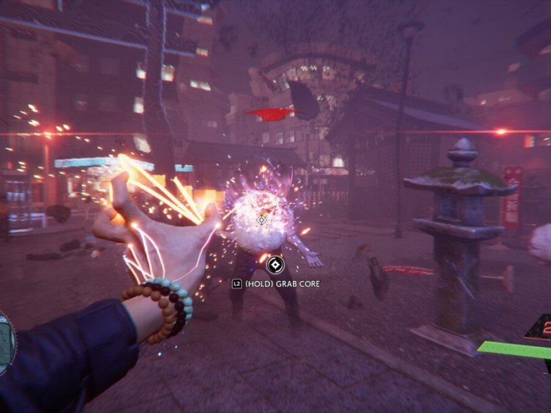 L'un des aspects qui a le plus intrigué dans l'annonce de Ghostwire: Tokyo était son système de jeu. Car, contrairement aux précédents projets du studio, le jeu est à la première personne et propose des combats axés sur les attaques élémentaires. Par conséquent, nous pouvons utiliser des éléments tels que l'air, le feu et l'eau pour exécuter des attaques rapides et puissantes en utilisant les incroyables compétences des doigts d'Akito. Ainsi, lors des affrontements, nous tirerons sur des énergies élémentaires qui endommagent les ennemis et les rendent vulnérables, lorsque cela se produit, nous les achevons en déchirant le noyau de leur esprit. Au début, la sensation d'utiliser des pouvoirs mystiques contre des créatures est sensationnelle. Cependant, il devient vite évident que nous utiliserons les mêmes mouvements tout au long de la campagne, quel que soit l'ennemi auquel nous sommes confrontés. Le titre donne même une variété dans le combat contre certains boss, cependant, dans la plupart d'entre eux, la technique est la même, on attaque jusqu'à ce qu'une rupture apparaisse dans le noyau et on la retire. Ce cycle se répète tout au long de la campagne et nous n'avons pas d'écart minimum, ce qui rend la plupart des combats fatigants très rapidement. De plus, lors des purifications que nous évoquions précédemment, il faut vaincre certaines créatures avant de purifier les lieux, c'est-à-dire que le jeu présente une progression répétitive et un combat qui parvient à abuser encore plus de la répétition… ce sont des aspects qui auraient vraiment pu être mieux travaillé dans Ghostwire: Tokyo .