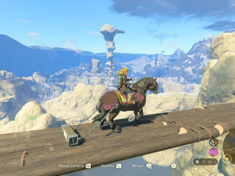 La Rétrospective et l'Infiltration sont deux pouvoirs également capables d'apporter de nombreuses améliorations à The Legend of Zelda : Tears of the Kingdom, notamment dans les modes d'exploration. La Rétrospective est un simple retour en arrière temporel d'un corps soumis à une force vectorielle, utile pour gagner en verticalité et effectuer des déplacements tactiques. Il est également capable de renvoyer ses propres projectiles (notamment les boules de boue ou les balles à pointes d'Octo) sur les ennemis, ce qui lui donne un outil supplémentaire sur le plan de l'action. L'Infiltration nous donne la possibilité de nous élever à travers n'importe quel plafond, ce qui est parfait lorsque vous voulez atteindre un endroit élevé sans avoir à escalader un mur. Il y a des limites à l'utilisation de cette capacité et celles-ci, heureusement, offrent plus d'équilibre dans l'utilisation globale du pouvoir. Particulièrement au début, la Rétrospective et l'Infiltration sont capables d'atténuer le problème de vigueur pendant l'escalade, rendant l'approche exploratoire le long d'une dimension verticale plus élastique. Dans Breath of the Wild, de nombreux joueurs ont dû s'arrêter de grimper parce qu'ils n'avaient pas assez de vigueur pour atteindre le sommet et poursuivre leur chemin. Grâce à ces deux pouvoirs, la liberté de mouvement est plus étendue et ne connaît aucune contrainte, du moins dans le cercle des restrictions. Si l'Amalgame est notre ami créatif dans The Legend of Zelda : Tears of the Kingdom, l'Emprise est notre compagnon ingénieur. Il vous permet de "coller" chaque pièce de construction, en ajustant sa position et sa direction, pour développer des moyens de transport et des œuvres architecturales. Des poutres en bois aux voiles en passant par les roues et les nouveaux engins de Soneau, chaque pièce sera indispensable en fonction de ce que nous avons en tête de construire. Construire un radeau motorisé avec des turbines, c'est passer d'une rive à l'autre d'un lac ou d'une rivière sans craindre de se noyer à cause de la vigueur. S'envoler à bord d'une montgolfière permet de contempler Hyrule d'en haut, d'observer les lignes de Nazca disséminées dans le royaume et de passer d'une île à l'autre dans le ciel. En ce qui concerne les appareils Soneau, qui peuvent être sélectionnés dans le menu spécifique, ils sont enfermés dans des sphères qui ne peuvent plus être collectées une fois qu'elles ont été " consommées ". On peut les trouver dans le monde entier ou à l'intérieur d'une grande "machine à boules", avec laquelle on peut obtenir des pièces aléatoires en y insérant les débris d'automates vaincus. N'oubliez pas que certains appareils ont une autonomie régulée par une batterie qui les maintient en marche.