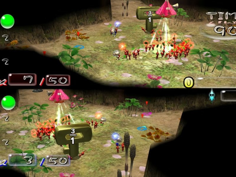 Le seul moyen pour Olimar d'interagir avec le monde extérieur et de collecter les pièces manquantes est de profiter des adorables indigènes locaux, des hybrides plantes-animaux qu'il baptise Pikmin. Ces pauvres bougres, avec leur docilité naïve, font tout pour plaire à l'extraterrestre, qui ne leur rend pas la politesse (coff coff Conquistadores) et les utilise comme des outils tout au long du jeu. Blague à part (aucun Pikmin n'a été maltraité au cours du titre), il les " lance " réellement pour ramasser des objets, détruire des murs trop durs, grimper en hauteur, entrer en collision avec la faune locale et ainsi résoudre diverses énigmes environnementales et étendre la zone visitable de la carte. En effet, trouver et cultiver de nouveaux types de Pikmin, c'est débloquer de nouvelles possibilités de jeu et de nouvelles zones de type "metroidvania". Autant dans le premier que, plus encore, dans le second volume. Sur la mécanique très simple de contrôler nos assistants à l'aide d'un sifflet, Nintendo avait en effet construit dans Pikmin 2 un gameplay de plus en plus raffiné, pour un titre destiné à rester inégalé grâce à son mélange des genres innovant, aujourd'hui comme hier. De nouvelles bestioles, des cartes plus complexes et des obstacles plus nombreux et raisonnés avaient été ajoutés. L'accent mis sur l'action et les affrontements avec des créatures hostiles avait augmenté, et les graphismes s'étaient améliorés. Il y avait aussi un mode multijoueur local, une course pour collecter le plus de ressources.